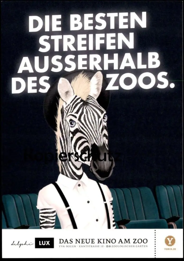 ÄLTERE POSTKARTE ZEBRA DIE BESTEN STREIFEN AUSSERHALB DES ZOOS BERLIN YORCK KINOGRUPPE KINO BABYLON KREUZBERG CAPITOL DAHLEM FILMTHEATER WERBUNGVerlag: unbekannt