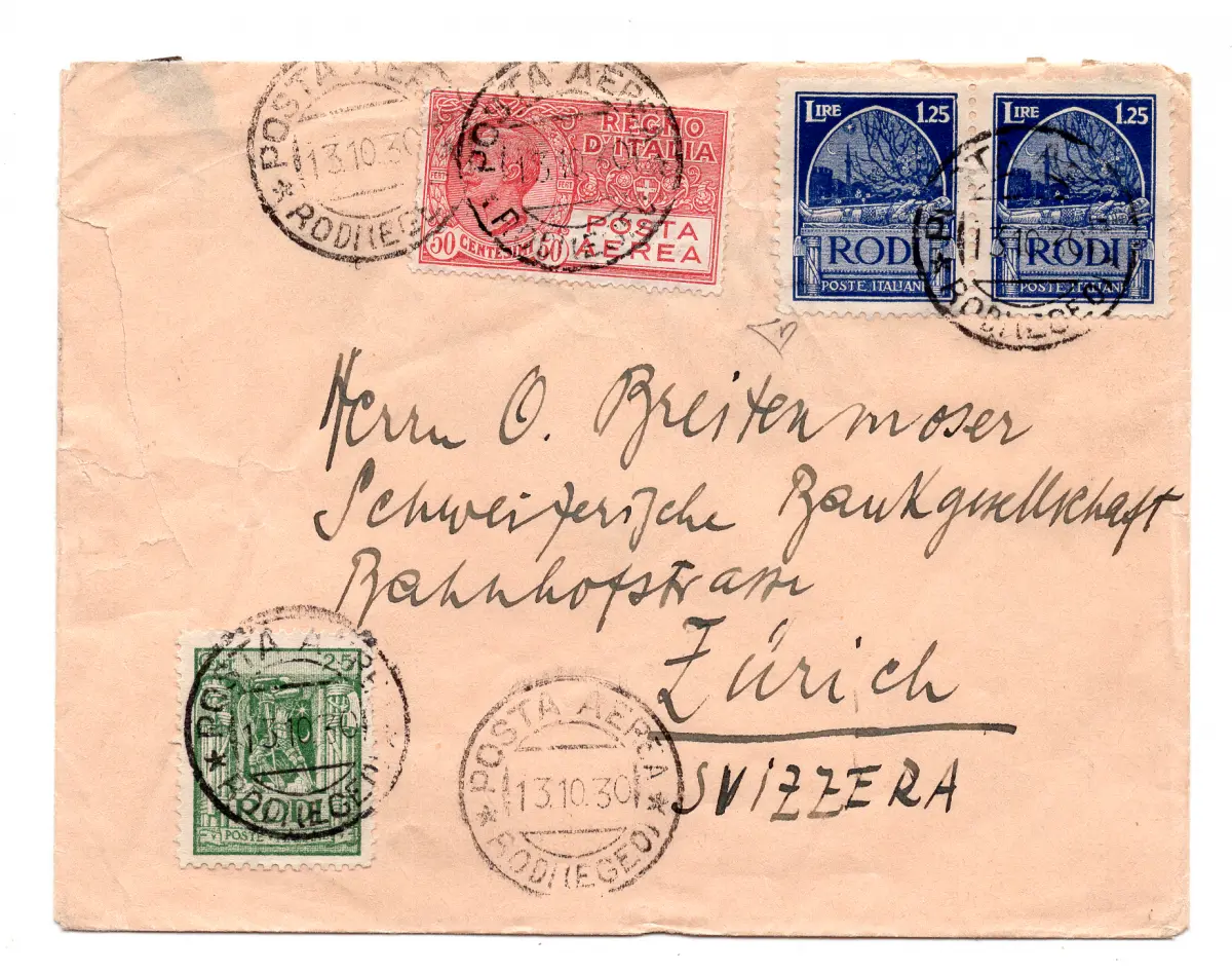- Ägäis - Malerische Lire 1,25 Nr. 9 Paar + Ergänzung Nr. 6 + Italien P.A. n. 2A auf Luftumschlag von Rhodos nach Zürich am 13.10.30 - Umschlag zerknittert (kleine Mängel) - ED Nr. 922/18