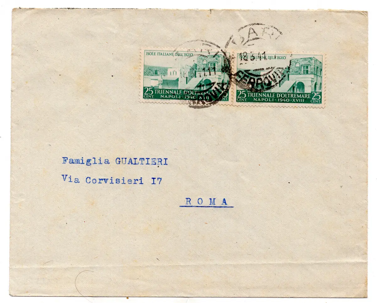 Umschlag - Ägäis - Triennale d'Oltremare Cent. 25 Nr. 113 Paar auf Umschlag, der am 18.3.41 von Bari nach Rom verschickt wurde - Seltene Verwendung von Briefmarken der Ägäis, die in Italien frankiert und nicht besteuert wurden - im Preis, ohne Stornierung der Ankunft Katalog Euro400 Cod.2231/WEB
