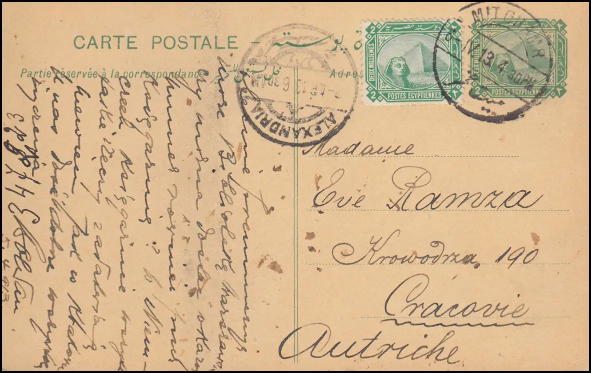 Durchgangsstempel Alexandria 7.4. Ganzsache Sphinx vor Cheops Pyramide als Auslandspostkarte in die Schweiz