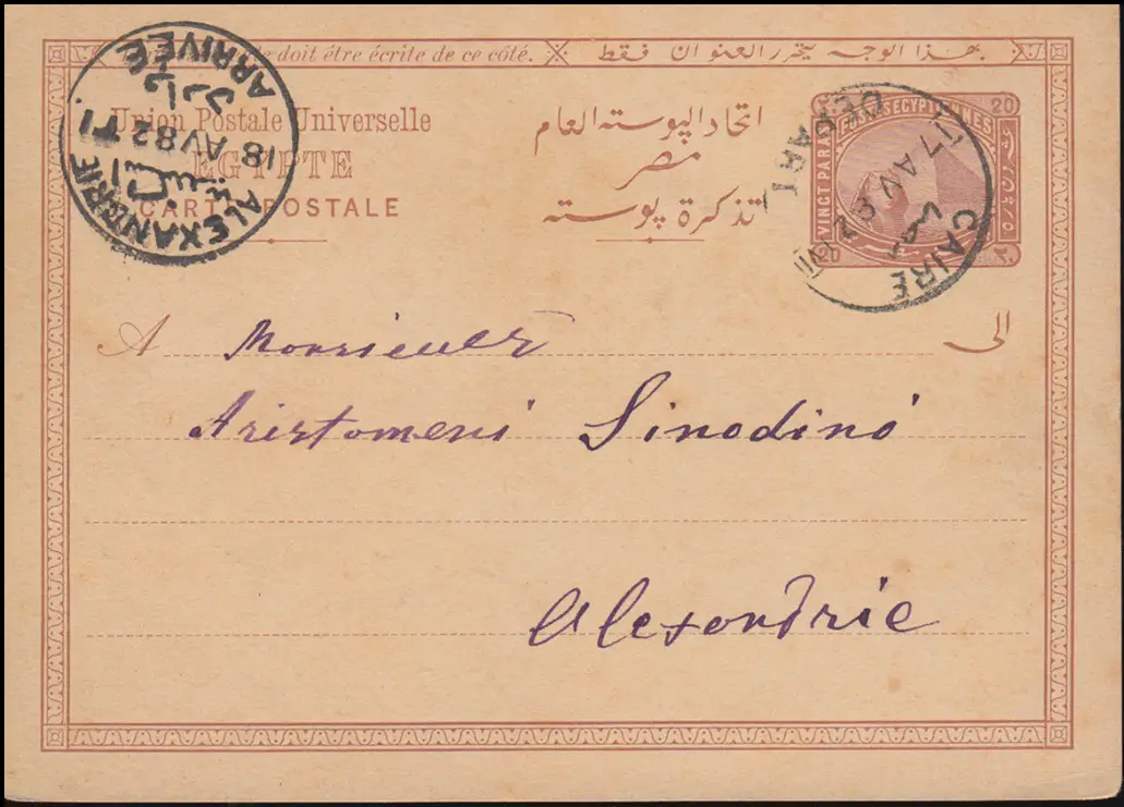 Ägypten Postkarte Pyramide 20 Paras von CAIRO 17.4.1882 nach ALEXANDRIA 18.4.