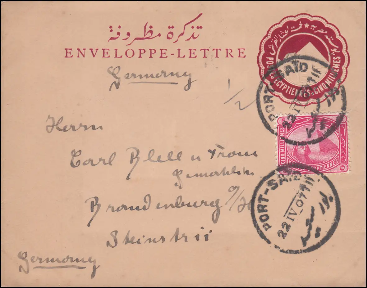 Ägypten Umschlag Pyramide 5 Mill. mit passender Zusatzfr. PORT SAID 22.4.1907