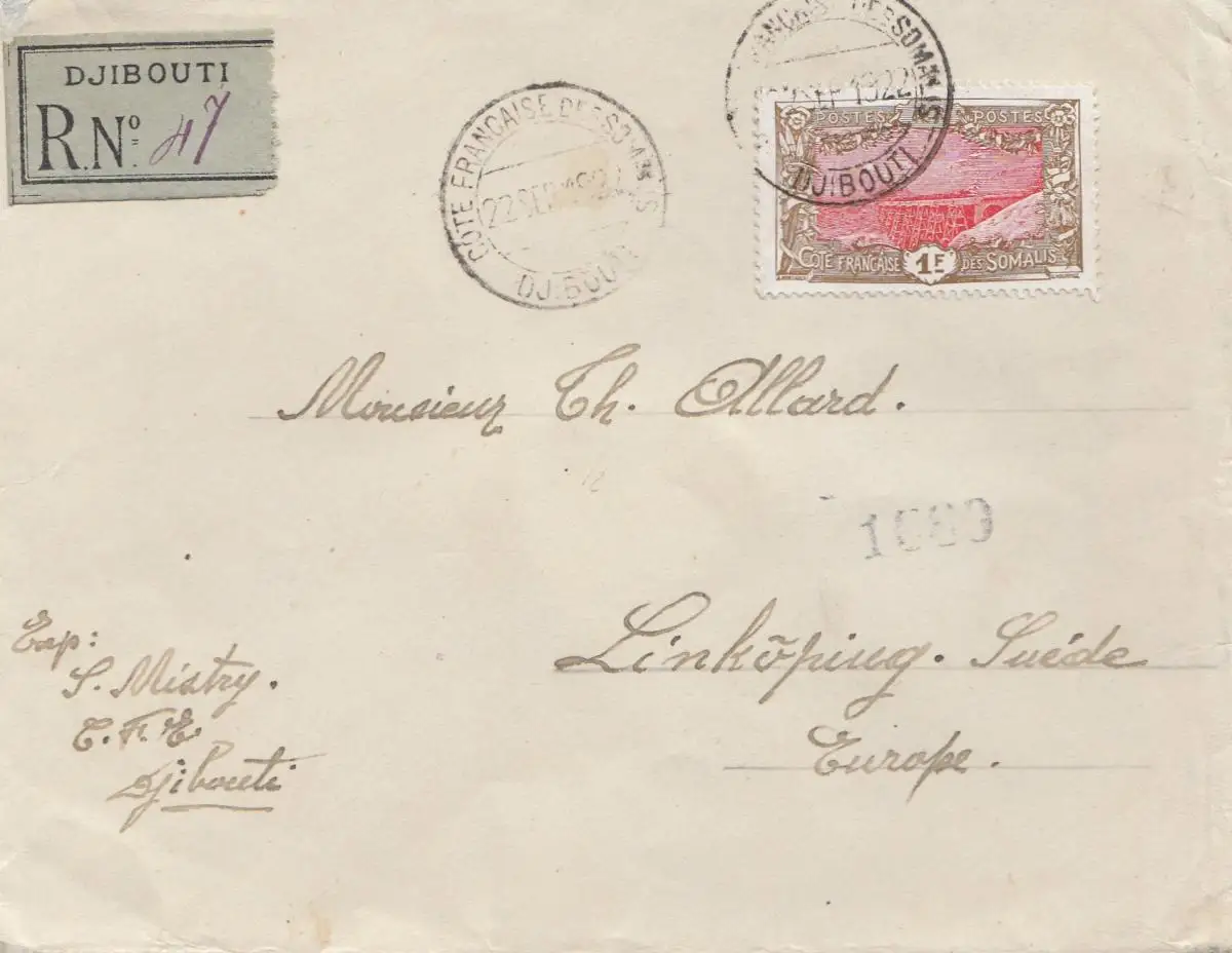 Äthiopien:Einschreiben Djibouti 1922 nach Linköping