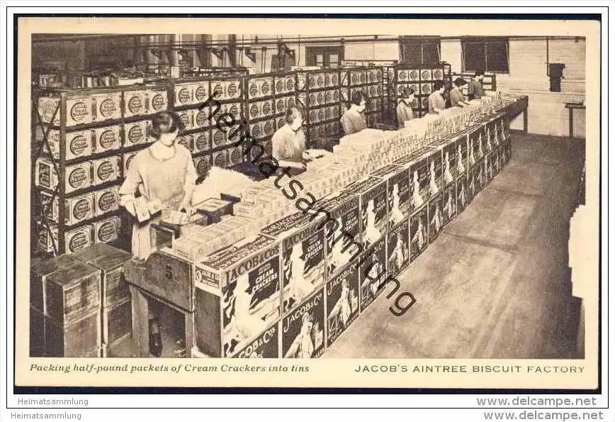 Aintree - W&R Jacobs Biscuit Factory - Packing half-pound packets of Cream Crackers into tins ca. 1920