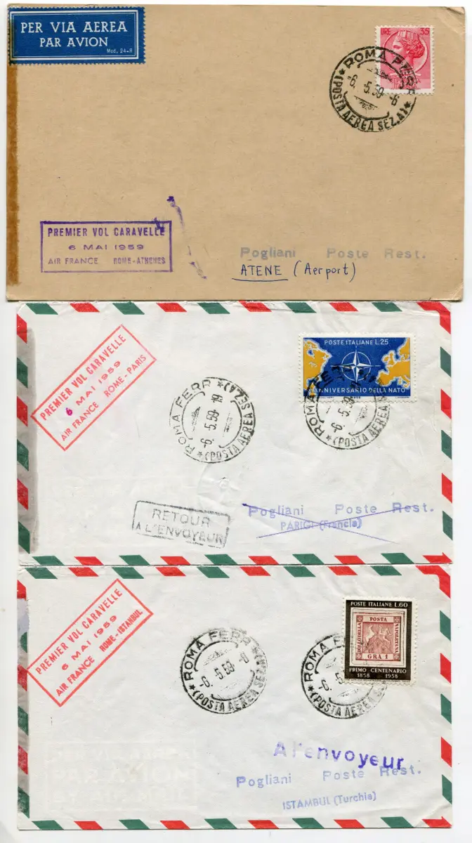 Air France Rom/Athen, Istanbul und Paris vom 6.5.59 Umschlag - Air France Rom/Athen, Istanbul und Paris vom 6.5.59 - drei Aerogramme mit Ann. des Fluges (Kat. Pilger Nr. 940, 942, 946) - Mittelwertige Umschläge für Scotchspuren links (perfekte Briefmarken) - Bewertung 210 Euro Cod. 574/14