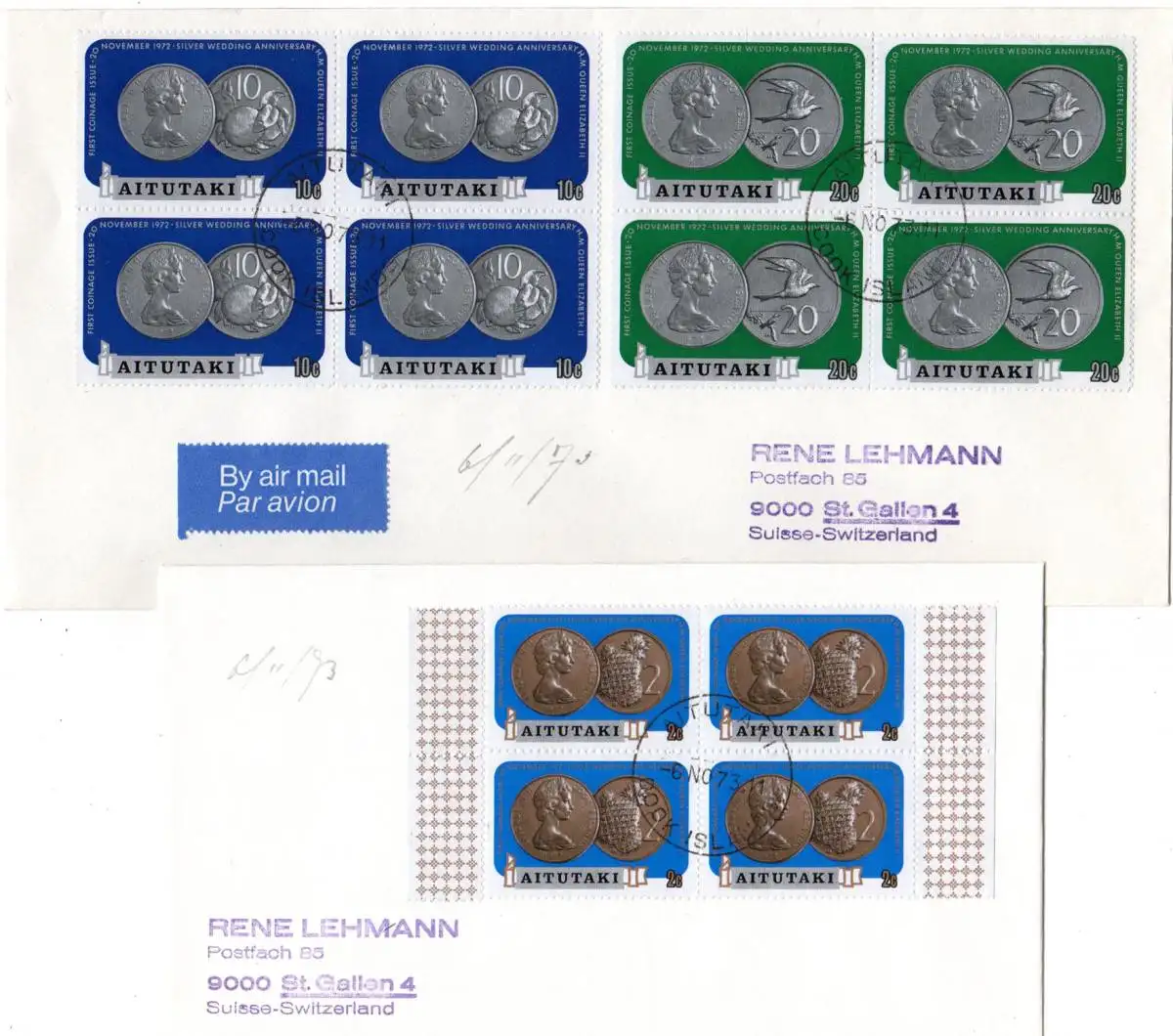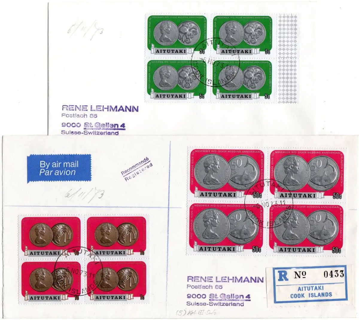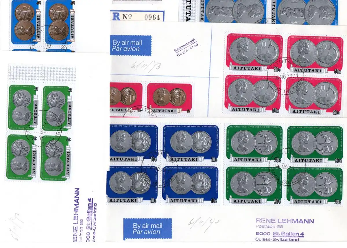Aitutaki 69-75, Kursmünzen kpl. 4er-Block Satz auf 5 Briefen, dabei Einschreiben
