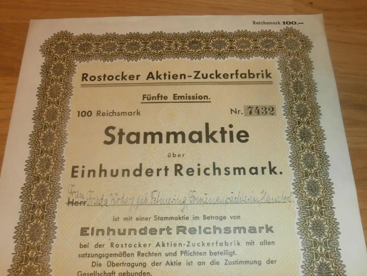 Aktie der Zuckerfabrik Rostock 1941 , Frieda Wodarg in Hanstorf b. Satow ,100 RM , Mecklenburg !!!