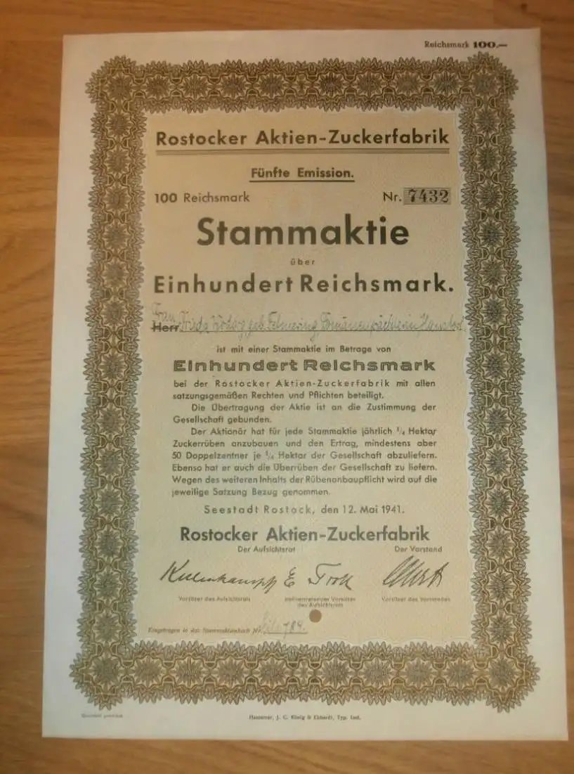 Aktie der Zuckerfabrik Rostock 1941 , Frieda Wodarg in Hanstorf b. Satow ,100 RM , Mecklenburg !!!AZB-1/WR3