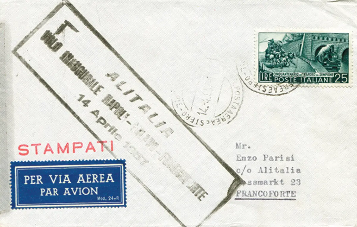 Alitalia Neapel/Frankfurt vom 14.4.57 - Aerogramm mit Annullierung Umschlag - Alitalia Neapel/Frankfurt vom 14.4.57 - Aerogramm mit Sonderflugannullierung (Kat. Pilger Nr. 710) - Umschlag mit Scotchspur links - - Ungewöhnlich - Bewertung 90 Cod. 553/14