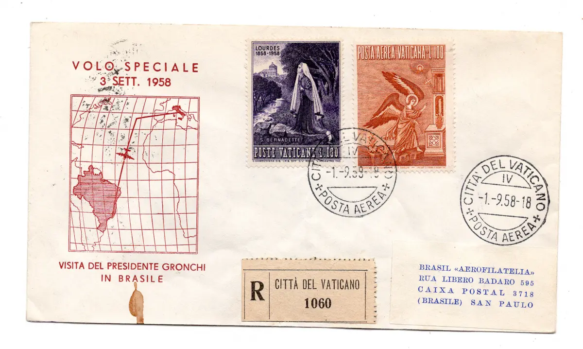 Alitalia Sonderflug Presidente Gronchi - Versand vom Vatikan Umschlag - Alitalia Sonderflug vom 3.9.58 zum Besuch von Präsident Gronchi in Brasilien - Aerogramm vom Vatikan am 1.9.58 nach Brasilien mit Präsidentschaftsflug (Kat. Pilger Nr. 283AC) - Ungewöhnlich nur 100 transportiert Cod. 993/19