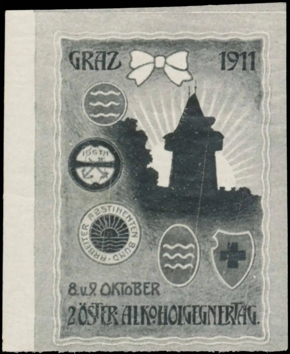 2. Österreich. Alkoholgegnertag, Antialkoholiker, Ausstellung über den Alkoholismus, schwarz, Größe/Zustand: 5x4 , guter Zustand, Original alte Reklamemarke die seinerzeit für die Werbung benutzt wurde