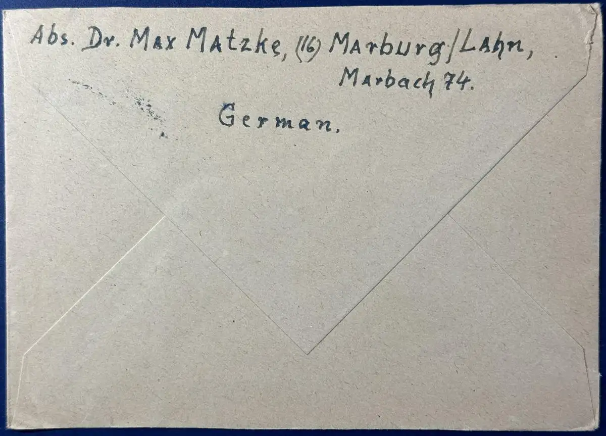 Bedarfsbrief, frankiert mit Mi.Nr. 85wg (senkrechtes Paar), gelaufen mit Poststempel vom 25.01.1949 von Marburg/Lahn nach NewYork/USA.