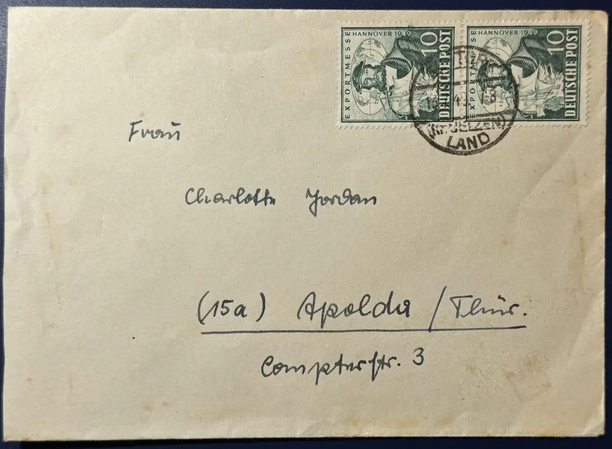 Mehrfachfrankierung, 2x Mi.Nr. 103 (senkrechtes Paar), gelaufen mit Poststempel vom 13.07.1949 von Ebstorf (Kreis Uelzen) nach Apolda/Thüringen.