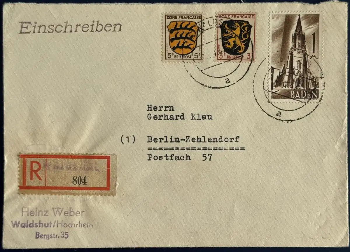 Bedarfsbrief, Französische Zone (Baden), Einschreiben, Mischfrankatur, bestehend aus Baden, Mi.Nr.13 sowie Allgem. Ausgaben, Mi.Nr.2 und 3, gelaufen mit Poststempel vom xx.08.1947 von Waldshut/Hochrhein nach Berlin-Zehlendorf (Ankunftstempel auf der Rückseite).