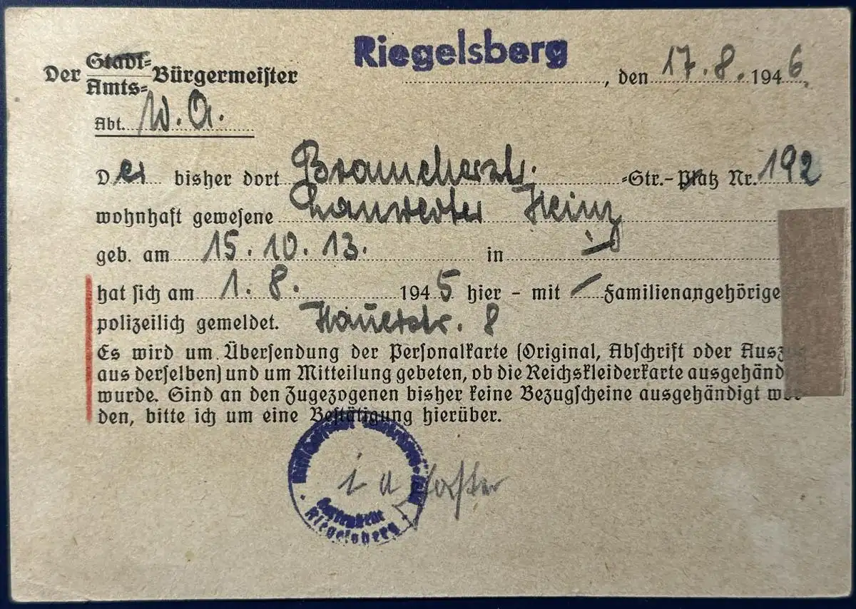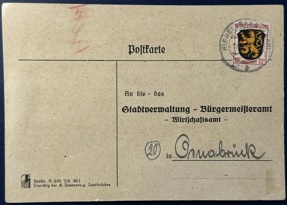 Postkarte, Amtsvordruck, 1946, frankiert mit Mi.Nr. 6, gelaufen mit Poststempel vom 19.08.1946 von Riegelsberg nach Osnabrück, Karte ist gut erhalten (siehe Scan).