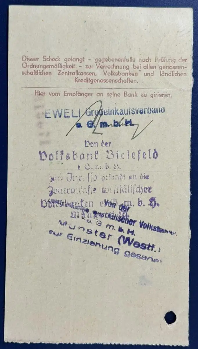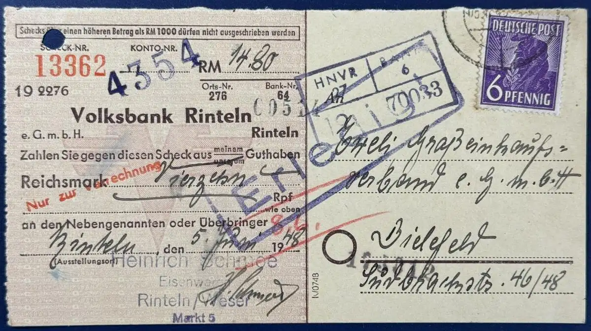 All.Besetzung Gemeinschaftsausgaben, Beleg Scheckeinreichung, 1948, frankiert mit Mi.Nr. 944, gelaufen mit Poststempel vom 05.06.1948, von Rinteln nach Bielefeld, Format 14,6x8 cm.
