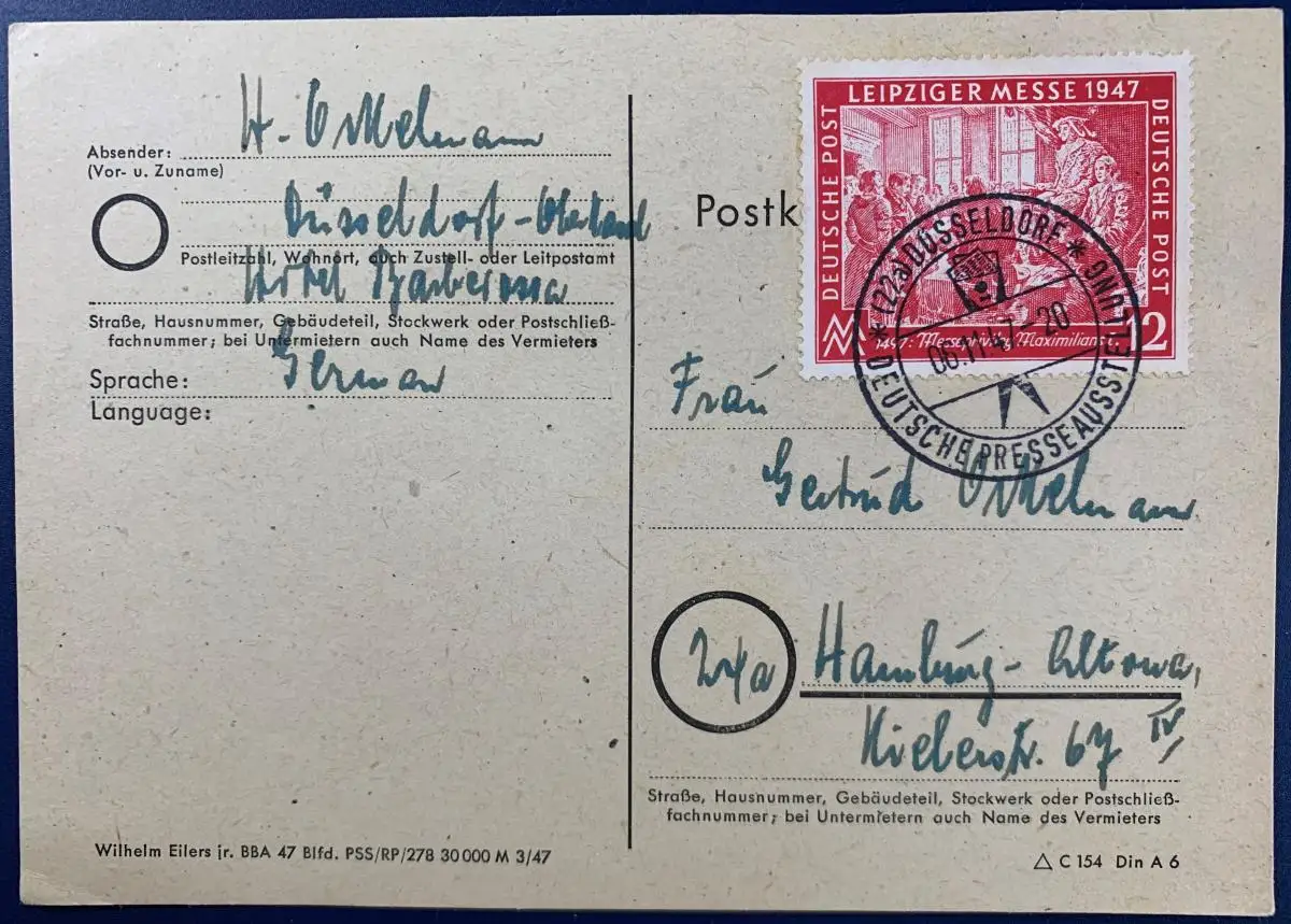 Frankiert mit Mi.Nr. 965, gelaufen mit Sonderstempel der Deutschen Presseausstellung Düsseldorf vom 06.11.1947 von Düsseldorf nach Hamburg-Altona.
