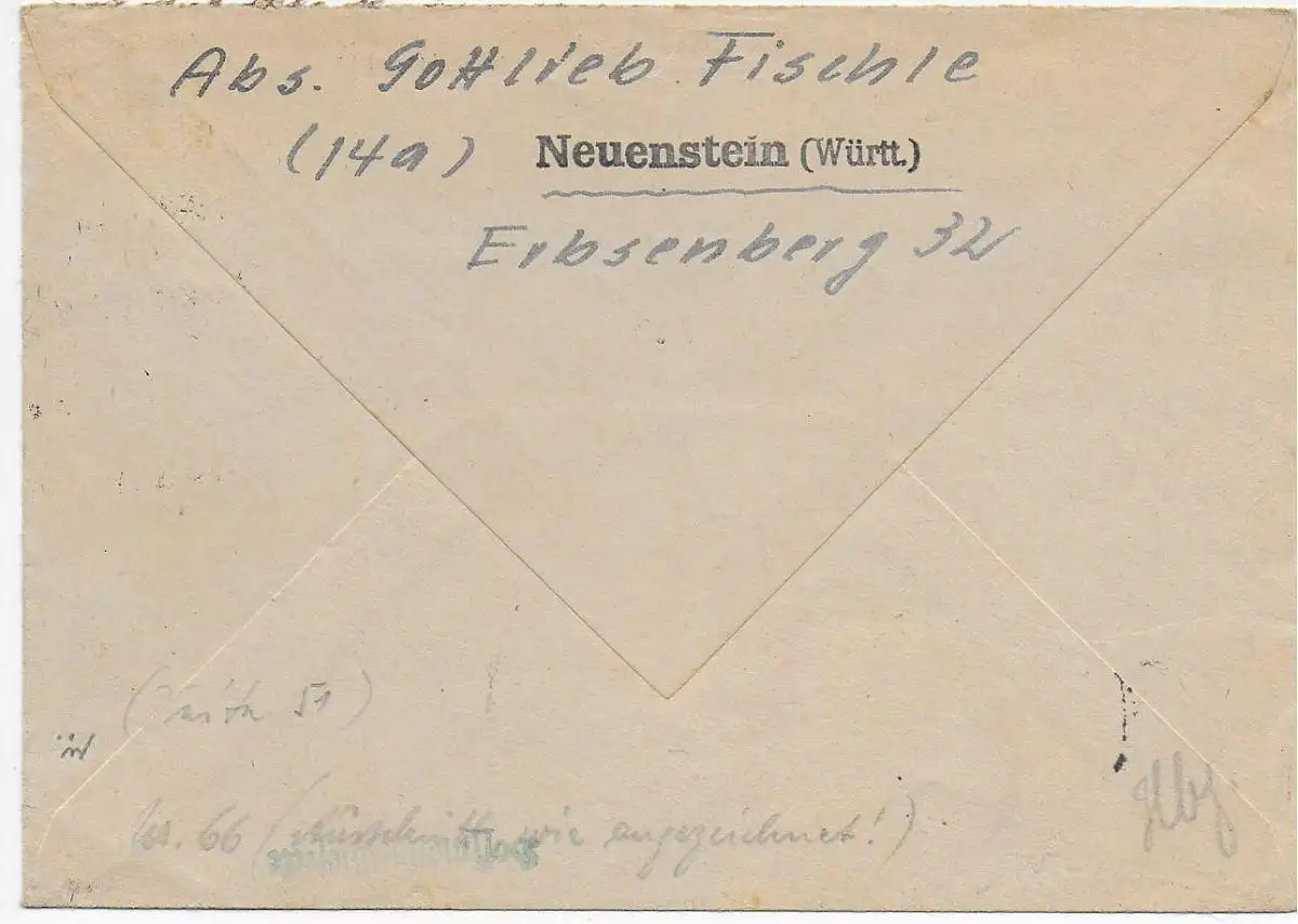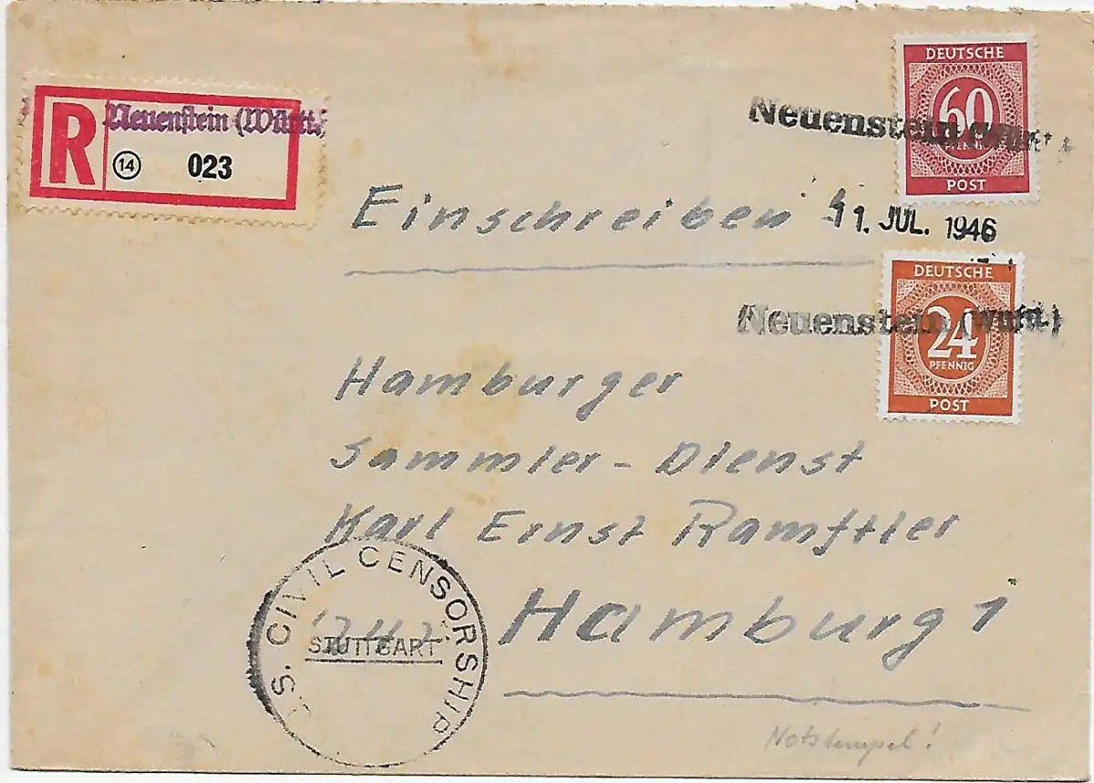 All. Besetzung 1946: Einschreiben Neuenstein nach Hamburg, Zensur Stuttgart