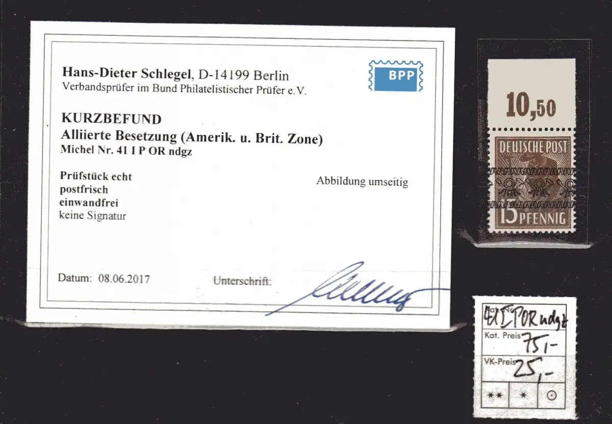 Allierte Besetzung, Bizone, Mi.-Nr. 41 I P ndgz OR, KB. SchlegelBPP.