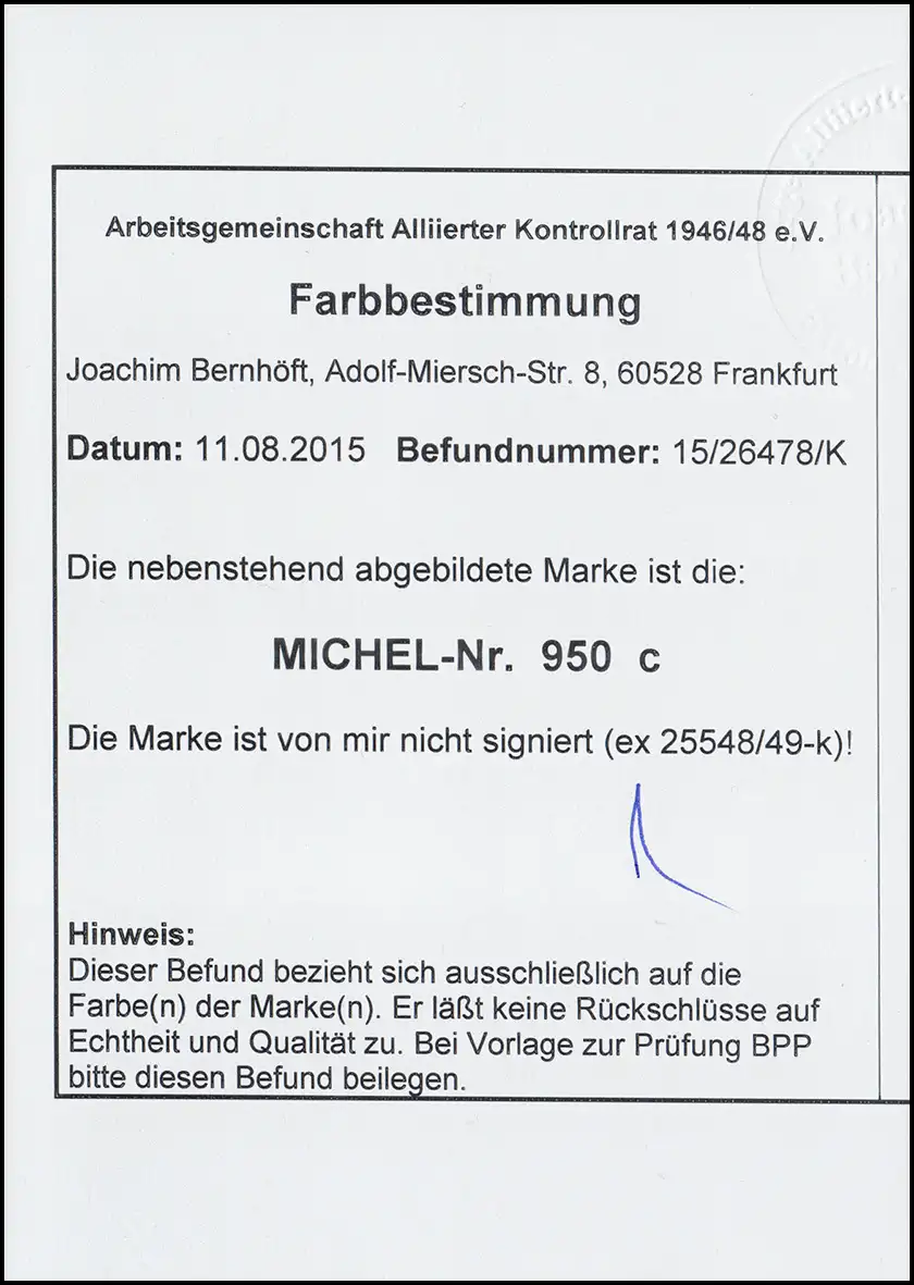 Mit Befund / Farbbestimmung der Arge Kontrollrat Bernhöft, einwandfrei postfrisch **