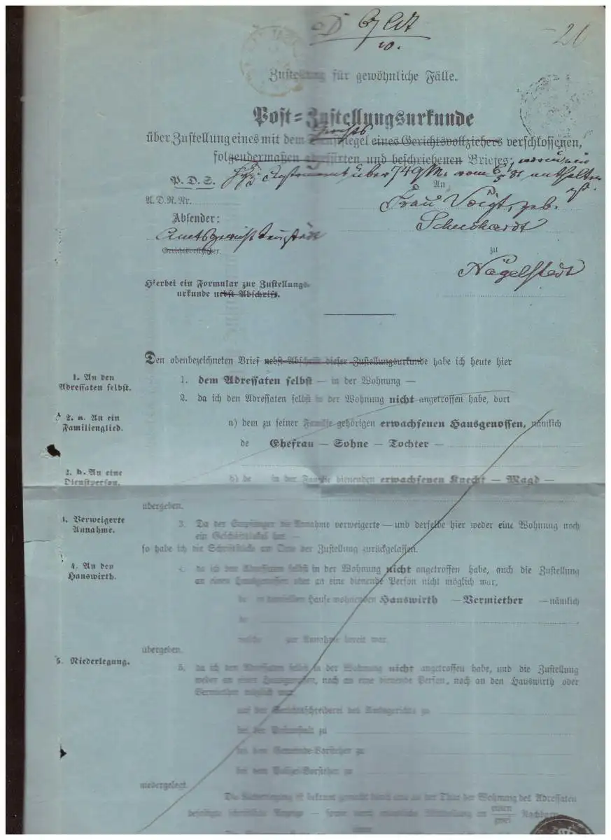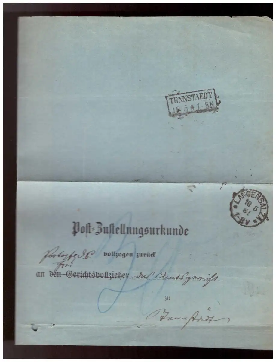 AD- Preussen (020177) Zustellurkunde Nachporto Langensalza 1881