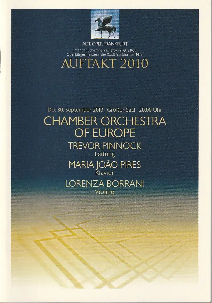 Cambre Orchestra of Europe . Leitung: Trevor Pinnock. Maria Joao, Klavier / Lorenza Borrani, Violine. Programm: FELIX MENDELSSOHN BARTHOLDY: Ouvertüre zum Mörchen von der schönen Melusine, F-Dur, op. 32. WOLFGANG AMADEUS MOZART: Klavierkonzert Nr. 27 B-Dur KV 595. Rondo für Violine und Orchester C-Dur KV 373. FRANZ SCHUBERT: Sinfonie Nr. 7 h-Moll D 759. - Theaterprogramm, Opernprogramm, Ballettprogramm, Musicalprogramm, Konzertprogramm, Theatermemorabilia, Programmhefte Sammlung, deutsche Theatergeschichte.