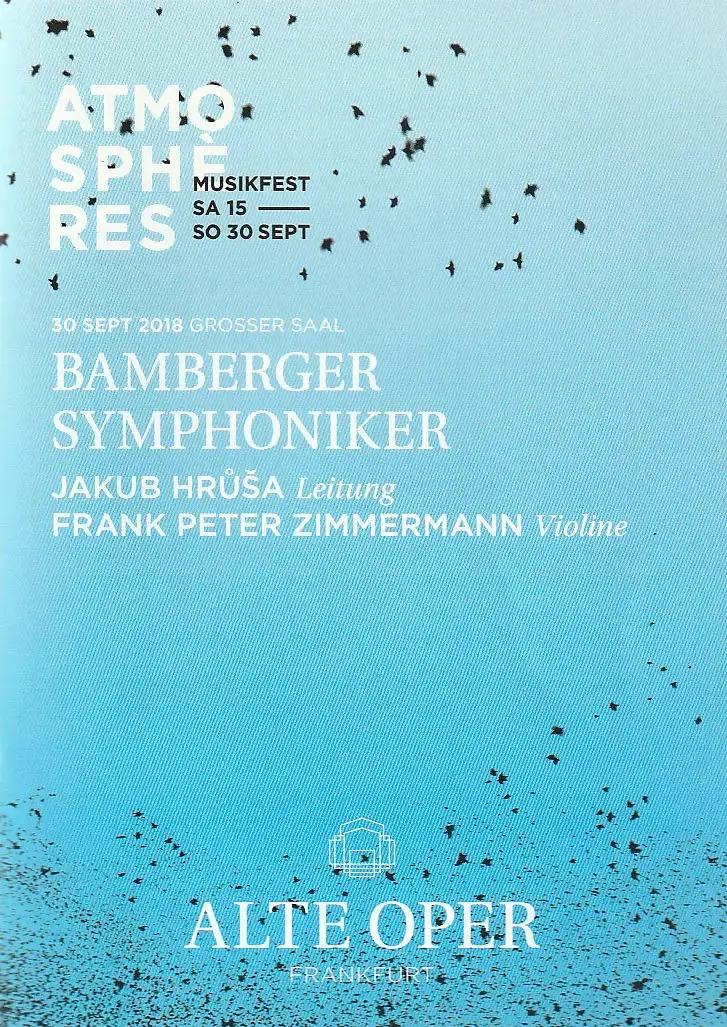 Bamberger Symphoniker. Leitung: Jakub Hrusa. Frank Peter Zimmermann, Violine. Programm: GYÖRGY LIGETI: Atmospheres für grosses Orchester. BOHUSLAV MARTINÜ: Konzert für Violine und Orchester Nr. 1. LEOS JANACEK: Grosse Suite aus der Oper Das Schlaue Füchslein. - Theaterprogramm, Opernprogramm, Ballettprogramm, Musicalprogramm, Konzertprogramm, Theatermemorabilia, Programmhefte Sammlung, deutsche Theatergeschichte.