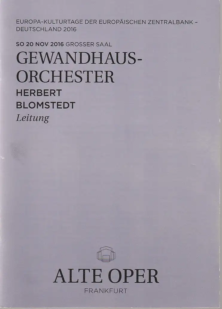 Alte Oper Frankfurt, Stephan Pauly, Gundula Tzschoppe, Karen Allihn: Programmheft GEWANDHAUSORCHESTER HERBERT BLOMSTEDT 20. November 2016 Grosser Saal Sonntagabendkonzerte 2016 / 17 Europa-Kulturtage der Europäischen Zentralbank-Deutschland 2016.