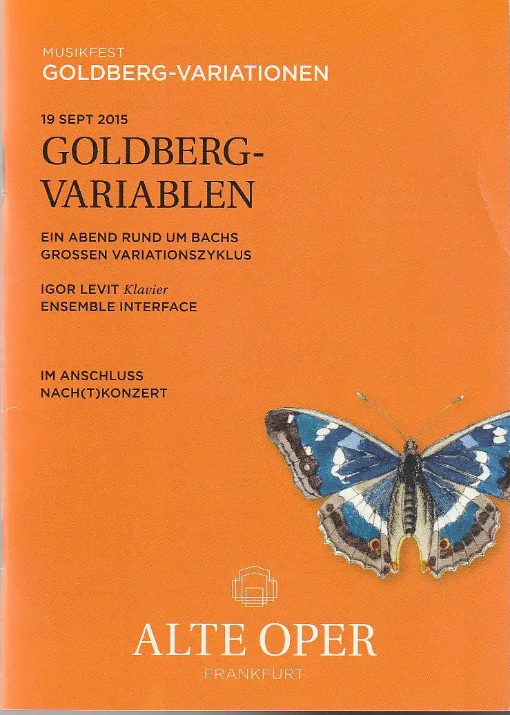Goldberg-Variablen. Ein Abend rund um Bachs Grossen Variationszyklus. Igor Levit, Klavier, Ensemble Interface. Programm: MARKO NIKODIJEVIC: grid / index, für Ensemble. Kompositionsauftrag der Alten Oper Frankfurt, Uraufführung. Dauer: ca. 10 min. JOHANN SEBASTIAN BACH: Goldberg-Variationen BWV 988. NACH(T)KONZERT: Mitwirkende: Almut Kühne, Sopran / Julia Böhme, Alt. Ensemble Auditivvokal Dresden, Ensemble Interface. Leitung: Olaf Katzer. Programm: MORTON FELDMANN: Rothko Chapel, füt Sopran, Alt, gemischten Chor und Instrumente. - Theaterprogramm, Opernprogramm, Ballettprogramm, Musicalprogramm, Konzertprogramm, Theatermemorabilia, Programmhefte Sammlung, deutsche Theatergeschichte.