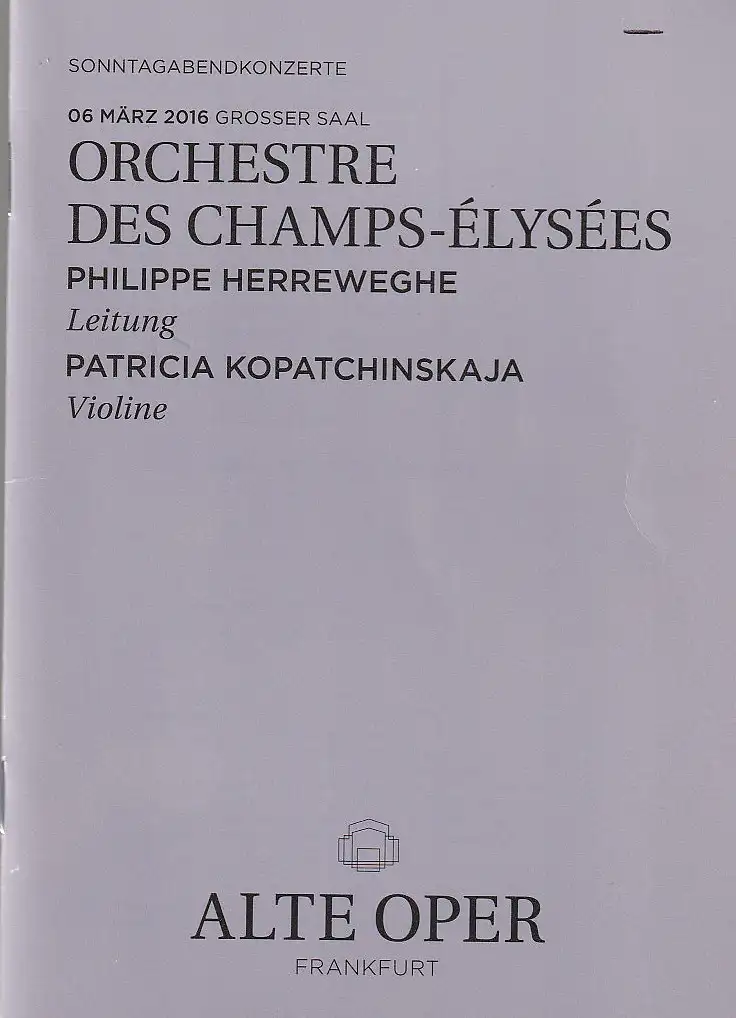 Orchestre des Champs-Elysees. Leitung: Philippe Herreweghe. Patricia Kopatchinskaja, Violine. Programm: LUDWIG VAN BEETHOVEN: Ouvertüre zum Trauerspiel Coriolan c-Moll op. 62. Sinfonie Nr. 5 c-Moll, op. 67. FELIX MENDELSSOHN BARTHOLDY: Konzert für Violine und Orchester e-Moll op. 64. - Theaterprogramm, Opernprogramm, Ballettprogramm, Musicalprogramm, Konzertprogramm, Theatermemorabilia, Programmhefte Sammlung, deutsche Theatergeschichte.