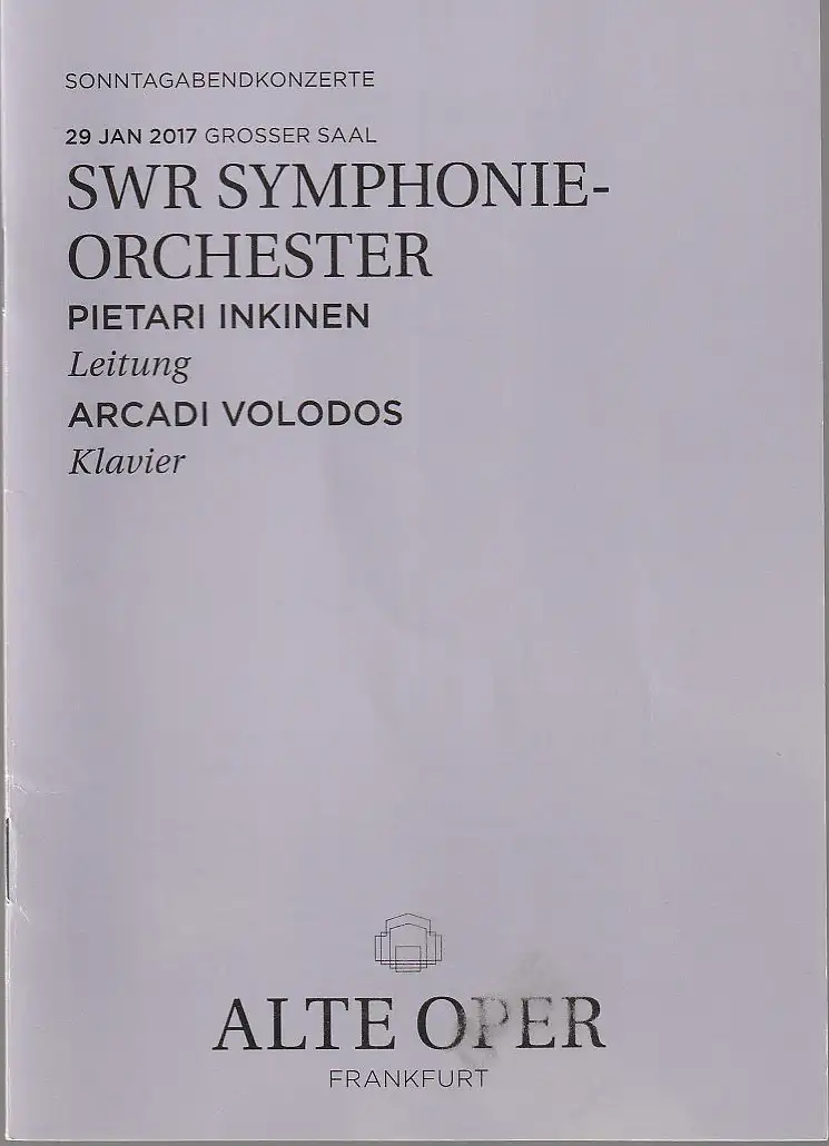 SWR Symphonieorchester. Leitung: Pietari Inkinen. Arcadi Volodos, Klavier. Programm: CARL MARIA VON WEBER: Ouvertüre zur Oper Euryante. LUDWIG VAN BEETHOVEN: Klavierkonzert Nr. 3 c-Moll op. 37 . JOHANNES BRAHMS: Sinfonie Nr.1 c-Moll op. 68 - Theaterprogramm, Opernprogramm, Ballettprogramm, Musicalprogramm, Konzertprogramm, Theatermemorabilia, Programmhefte Sammlung, deutsche Theatergeschichte.