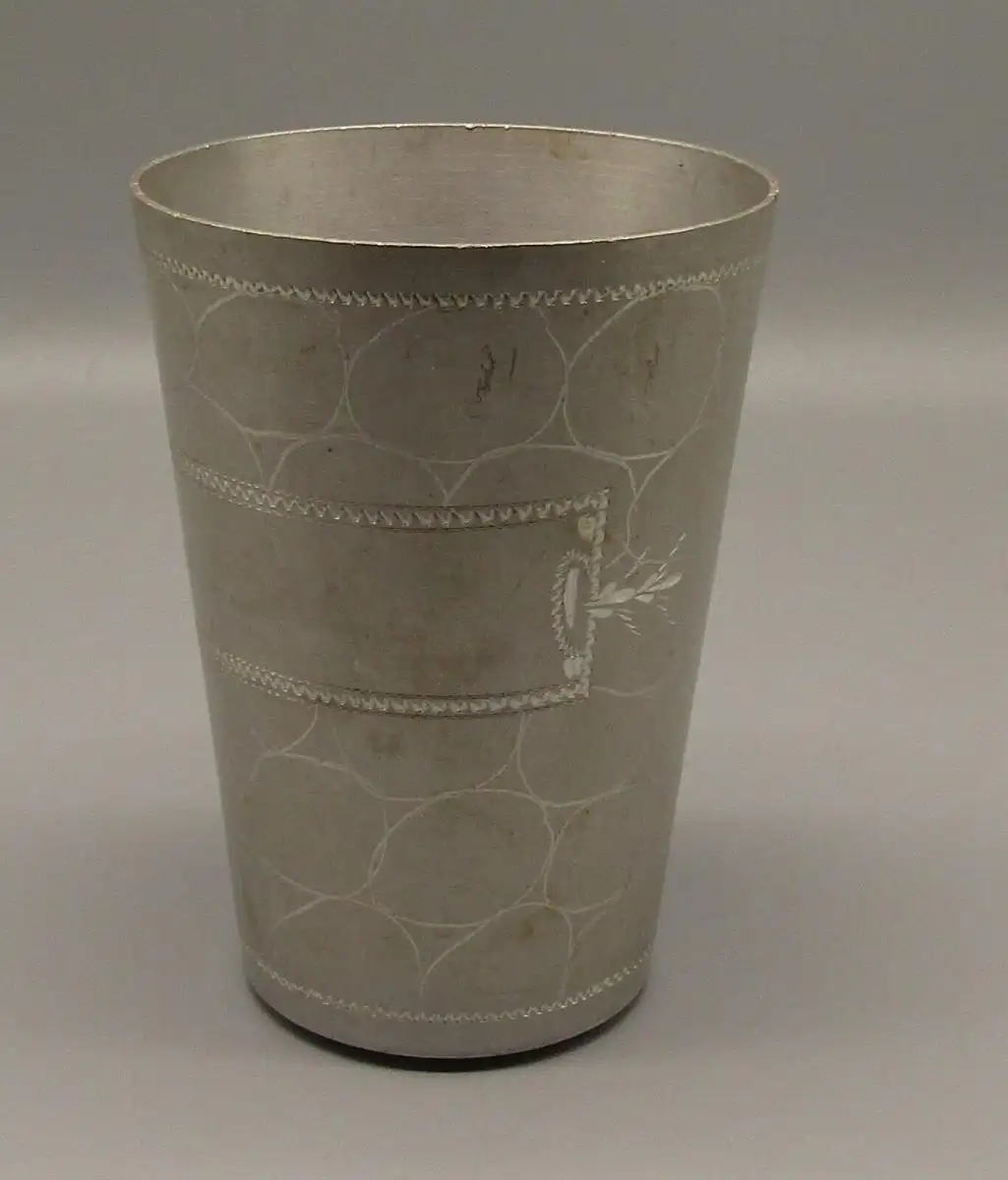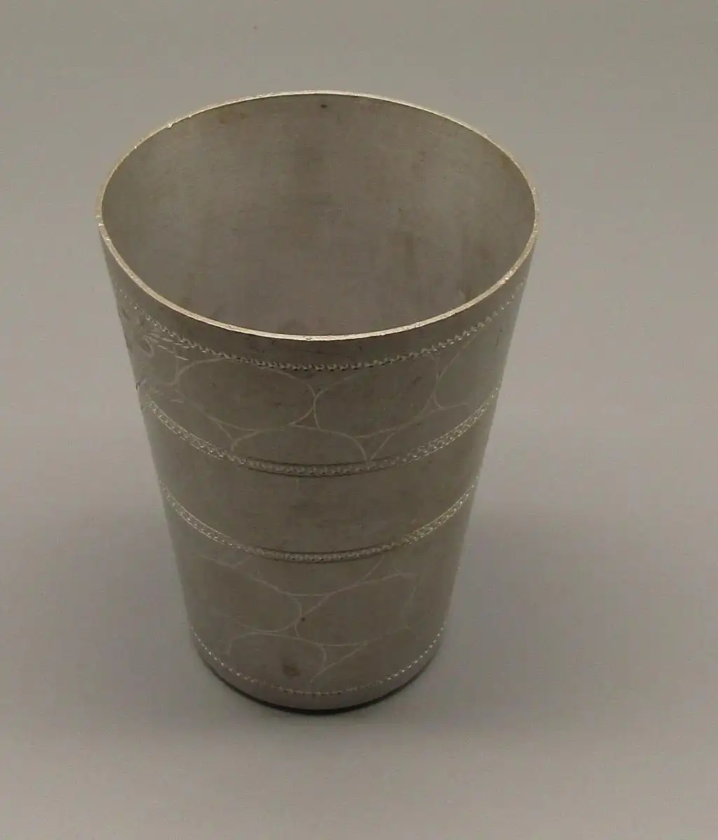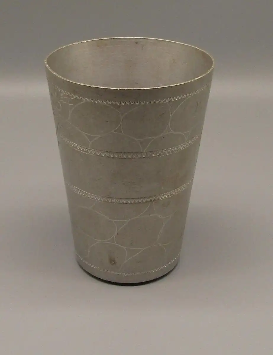 Becher mit einigen Kratzern, sowie mit einigen Flecken. Deckel gewölbt. Zustand wurde bereits im Preis berücksichtigt. Bilder sind ein Bestandteil der Zustandsbeschreibung.