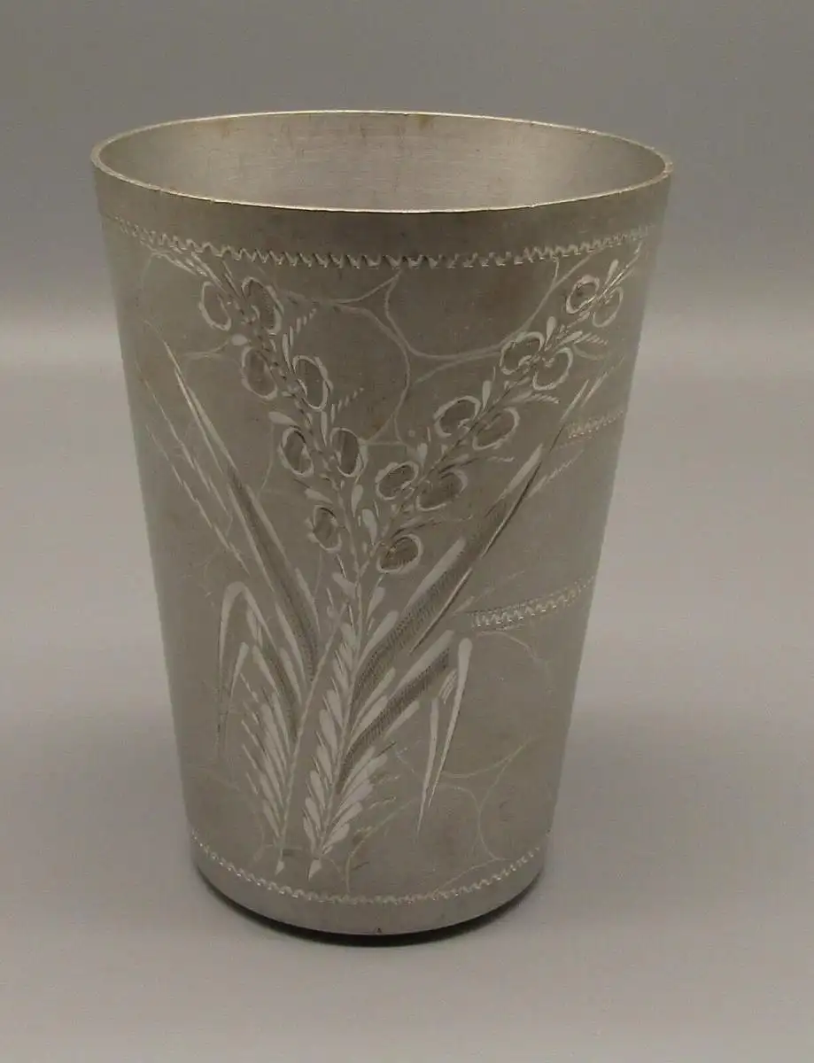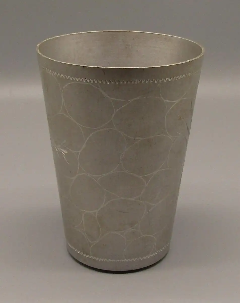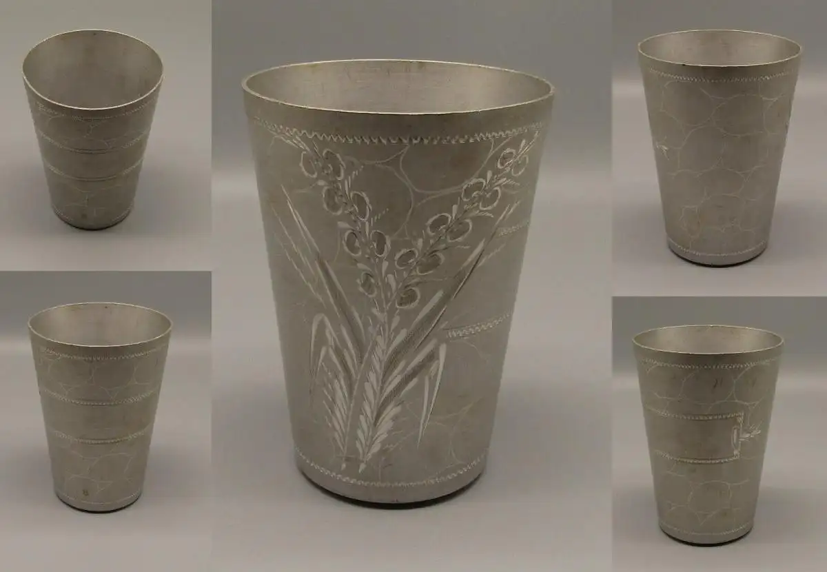 Becher mit einigen Kratzern, sowie mit einigen Flecken. Deckel gewölbt. Zustand wurde bereits im Preis berücksichtigt. Bilder sind ein Bestandteil der Zustandsbeschreibung.