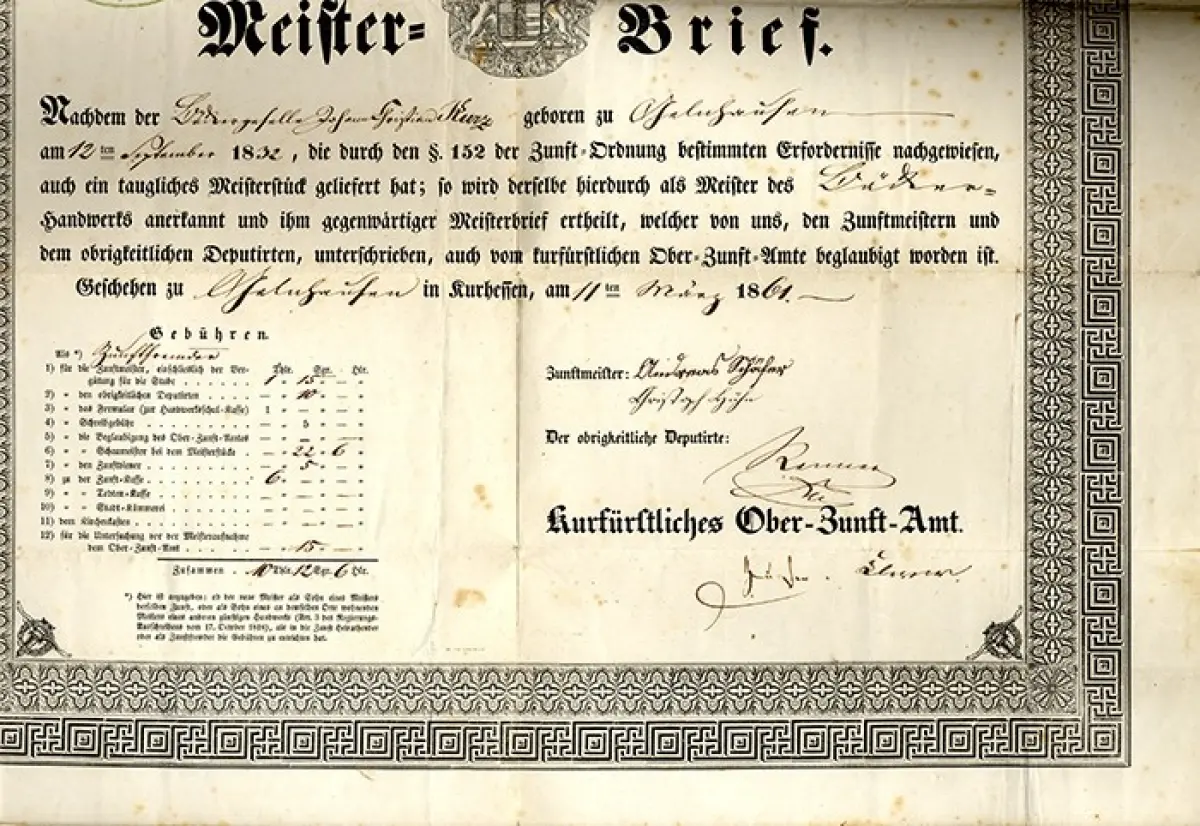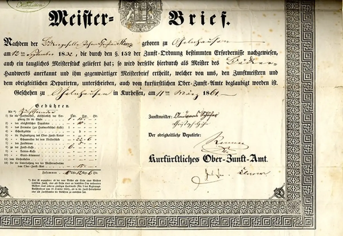 Altes Handwerk Bäcker Meisterbrief beglaubigt vom Ober Zunft Amt Kurhessen am 11. 03. 1861 den Ort kann ich leider nicht entziffern etwas Brief mit ornamentaler Verzierung an den Rändern und Kurhessen Wappen dickeres Papier gut erhalten mehrfach gefaltet