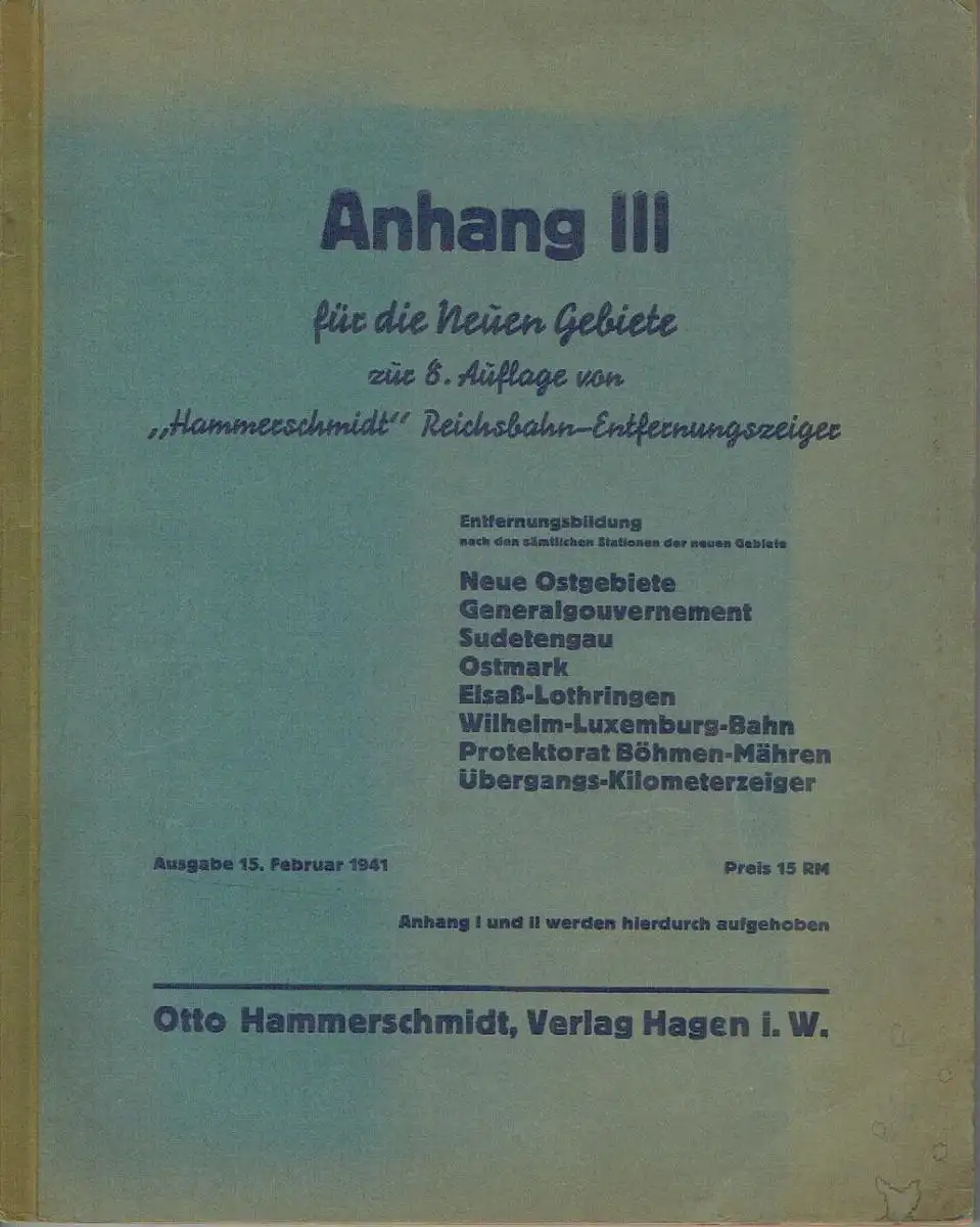 Anhang III für die neuen Gebiete zur 8. Auflage von "Hammerschmidt" Reichsbahn-Entfernungszeiger für die Güterbeförderug auf Schiene und Straße von jedem - nach jedem Güterbahnhof.