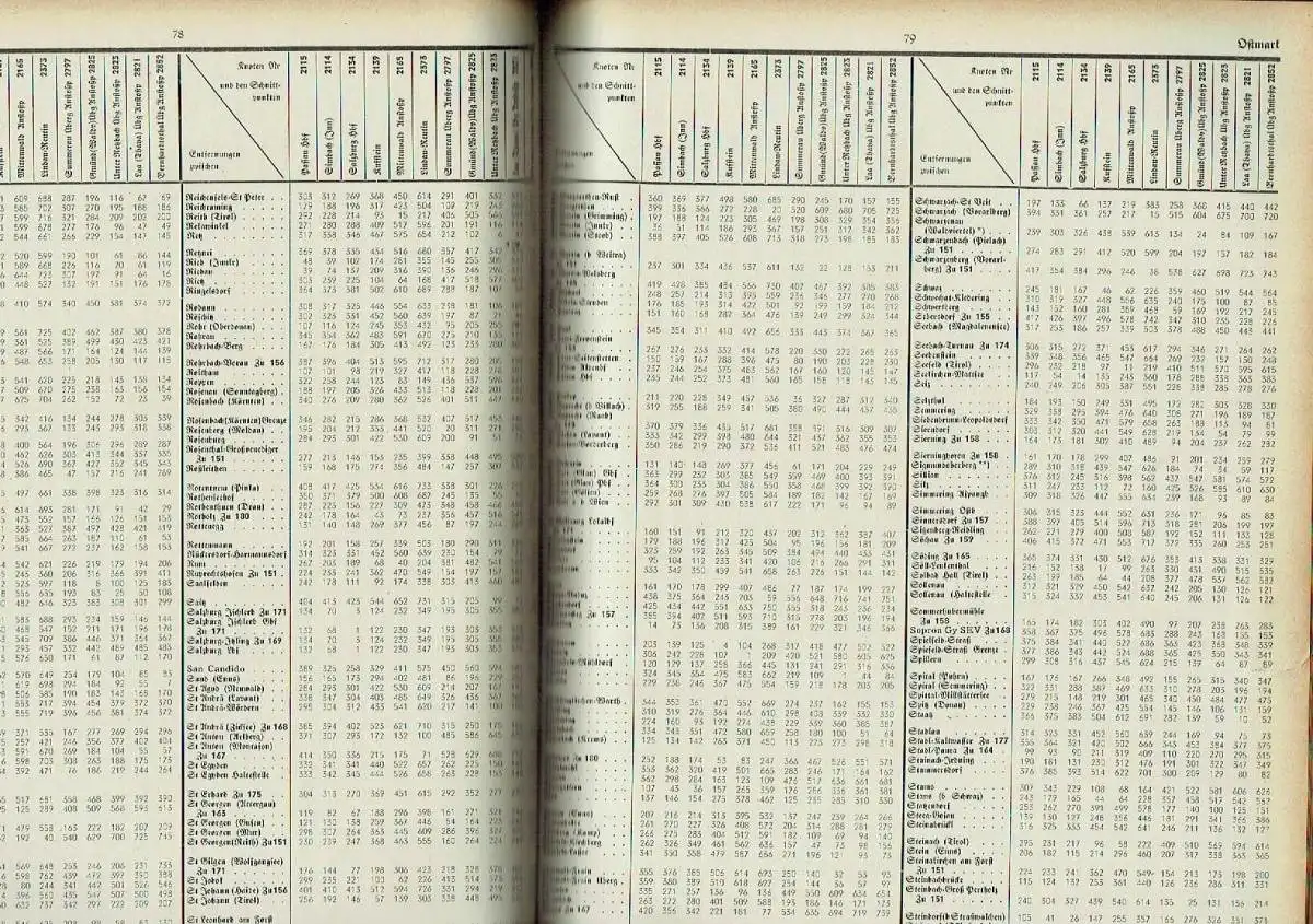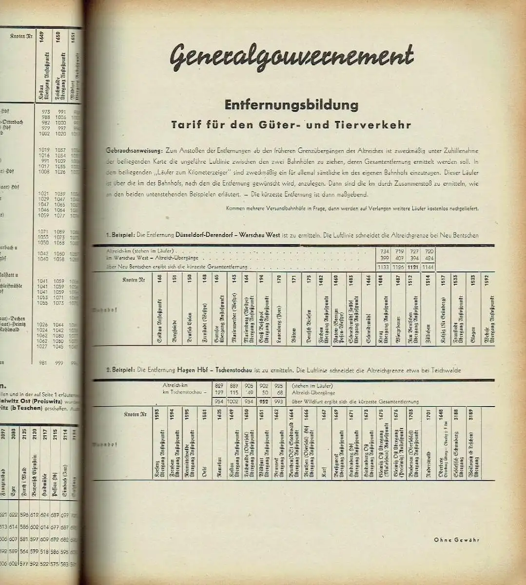guter Zustand, geringe Gebrauchs- und Alterungsspuren: Papier teils vergilbt, aber Seiten sauber und ordentlich - 13 Blatt mit kleier Blessur im senkrechten Rand - Umschlag und Seiten teils etwas eselsohrig, Neue Ostgebiete - Gebrauchsanweisung - Beispiele - Entfernungsbildung von und nach den neuen deutschen Ostgebieten - Kujawer Schmalspurbahn - Neue Übergänge nur für die Benutzer von Hammerschmidt - Reichsbahn-Entfernungszeiger - Generalgouvernement - Gebrauchsanweisung - Beispiele - Entfernungsbildung von und nach dem Generalgouvernement - Sudetengau - Vorbemerkungen - Entfernungsbildung von und nach dem Sudetengau - Ostmark - Vorbemerkungen - Entfernungsbildung von und nach der Ostmark - Elsaß-Lothringen - Vorbemerkungen - Entfernungsbildung von und nach Elsas-Lothringen - Wilhelm-Luxemburg-Bahn - Vorbemerkungen - Entfernungsbildung von und nach der Wilhelm-Luxemburg-Bahn - Protektorat Böhmen-Mähren - Vorbemerkungen - Beispiele - Entfernungsbildung von und nach dem Protektorat Böhmen-Mähren - Übergangs-Kilometerzeiger - Über die Strecken des Sudetengaues und des Protektorates Böhmen-Mähren - Gebrauchsanweisung - Beispiele - Entfernungsbildung - Eupen-Malmedy - Memelgebiet - Über die Strecken der Neuen Ostgebiete, kartoniert, ca. 26 x 32,5, 156 Seiten mit der "Läufer"-Beilage (komplett)