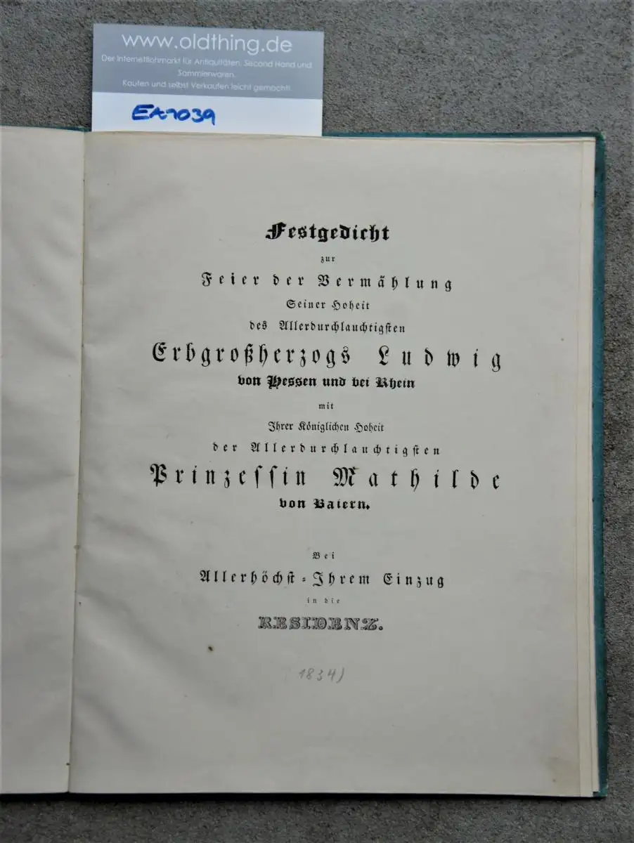 Titel: Festgedicht zur Feier der Vermählung Seiner Hoheit des Allerdurchlautigsten Erbgroßherzogs Ludwig von Hessen und bei Rhein mit Ihrer Königlichen Hoheit der Allerdurchlauchtigsten Prinzessin Mathilde von Baiern. Bei Allerhöchst-Ihrem Einzug in die Residenz.