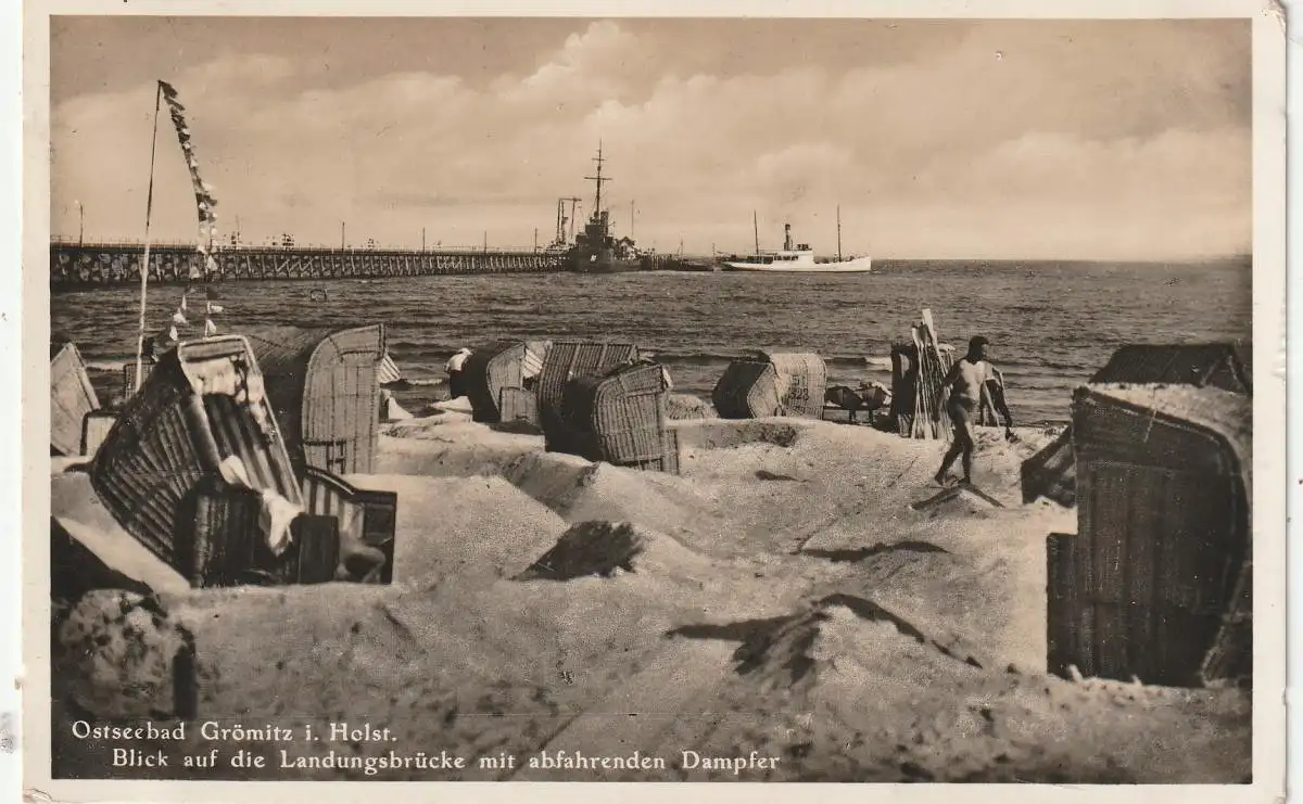 [Ansichtskarte] 2433 GRÖMITZ, Landungsbrücke, Dampfer, Strandkörbe, 1935.