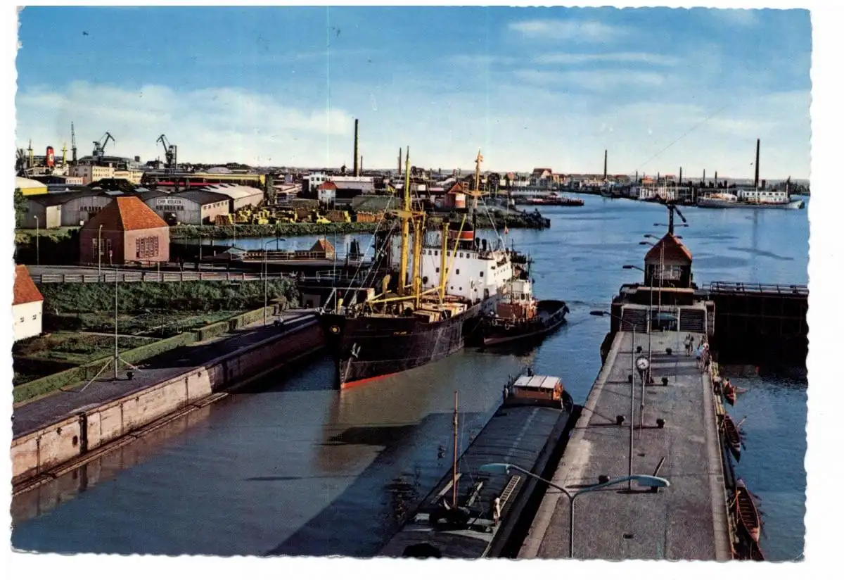 [Ansichtskarte] 2850 BREMERHAVEN, Fischereihafen / Doppelschleuse / Frachtschiffe / Schlepper.