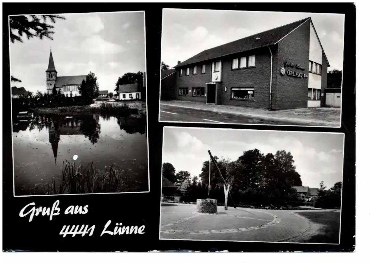 [Ansichtskarte] 4441 SPELLE - LÜNNE, Gasthof Hermes, Dorfweiher mit Kirche, Ziehbrunnen.