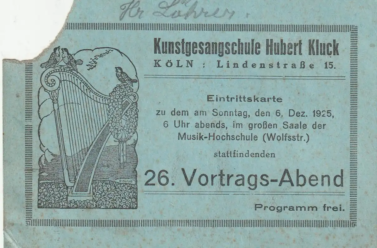 [Ansichtskarte] 5000 KÖLN, EREIGNIS, MUSIK, Vortrags - Abend - Kunstgesangschule Hubert Kluck, 1925, Eintrittskarte.