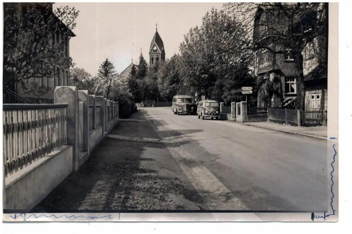 Titel: 5060 BERGISCH GLADBACH, Strassenansicht Nähe St. Laurentius - Kirche, Archivbeleg 15 x 10 cm, Ommibus, VW-Bus, 50er Jahre