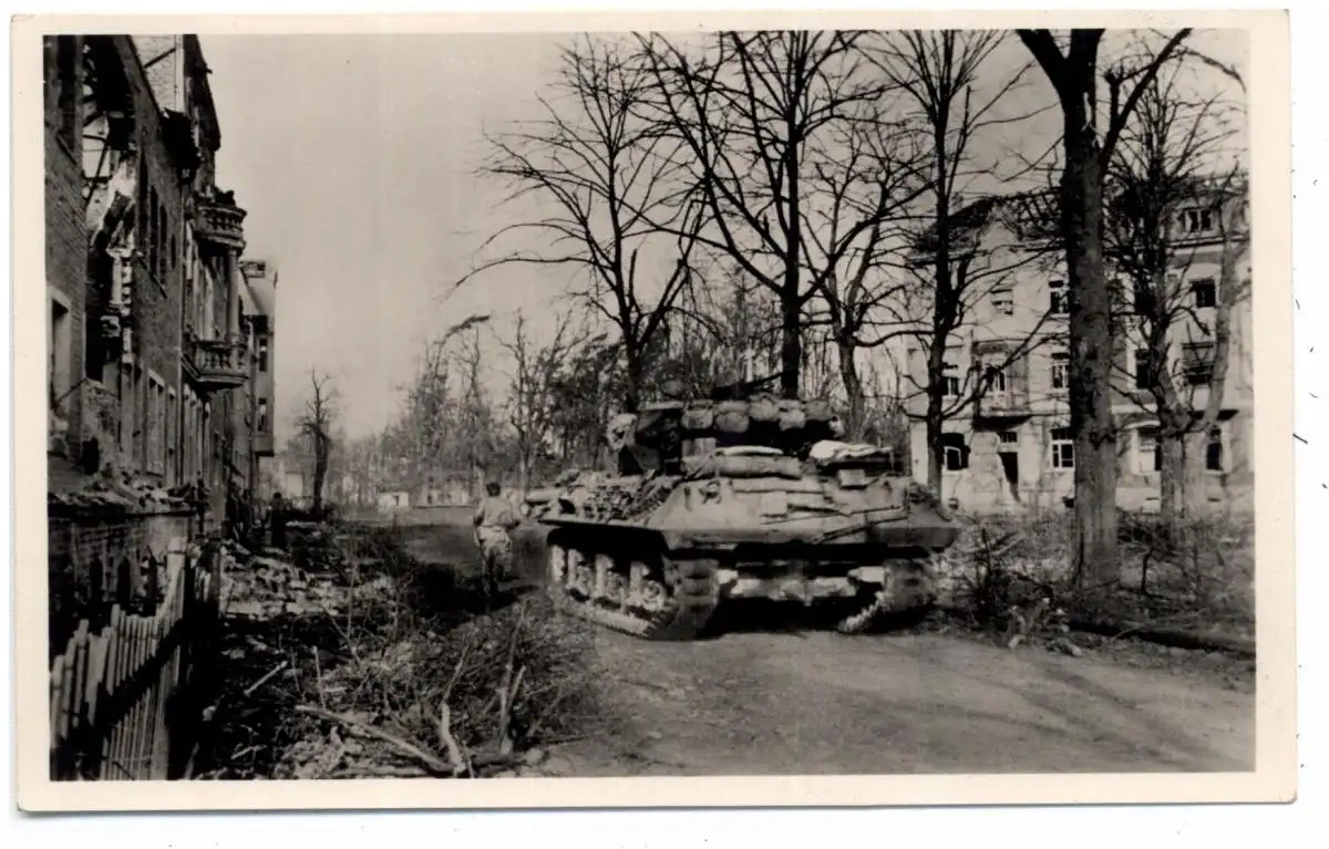 [Ansichtskarte] 5170 JÜLICH, 24. Februar 1945, Amerikanischer Panzer rückt am Probst-Bechte-Platz vor.