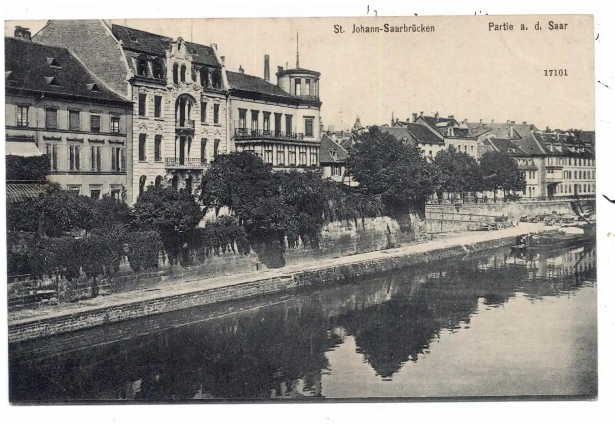 [Ansichtskarte] 6600 SAARBRÜCKEN - ST. JOHANN, Partie an der Saar, Frachtschiff, 1905.