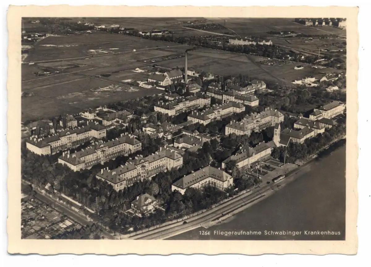 [Ansichtskarte] 8000 MÜNCHEN - SCHWABING, Krankenhaus und Umgebung, Luftaufnahme 1940.