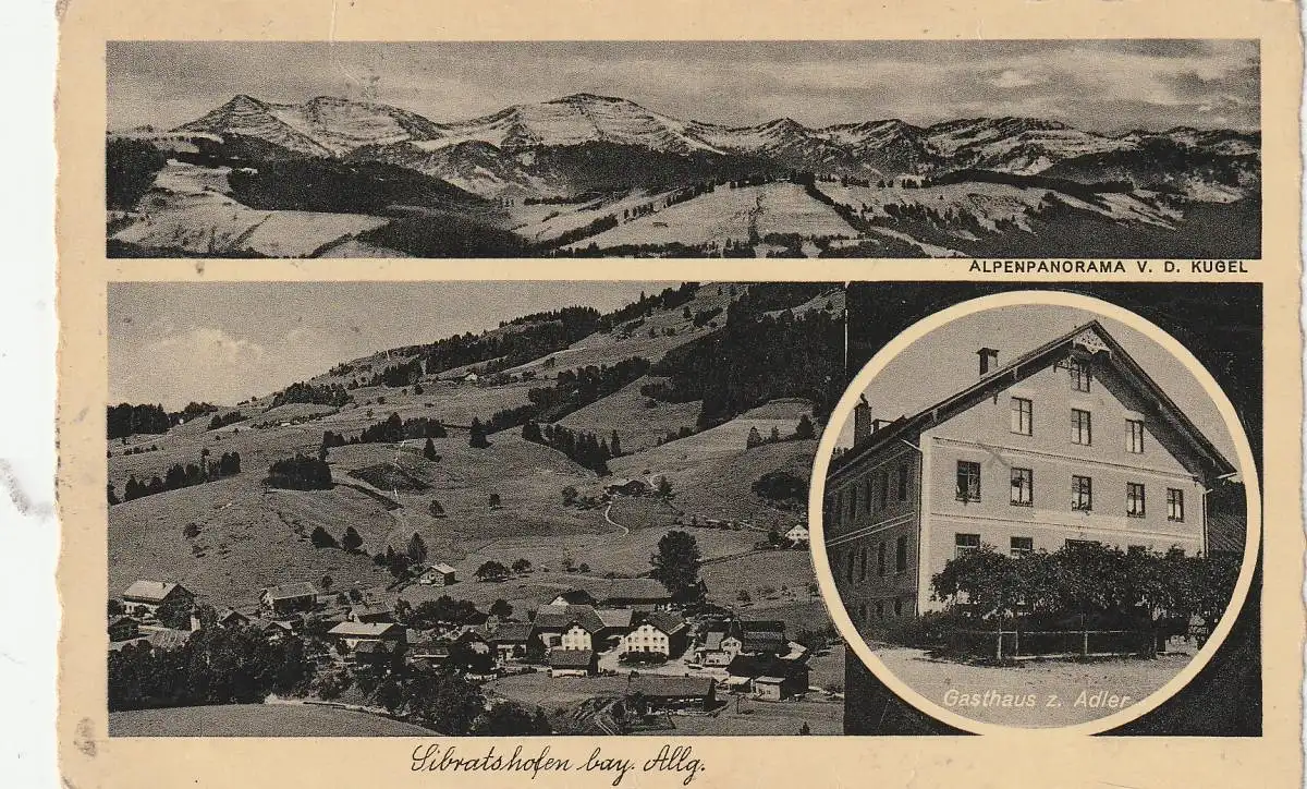 [Ansichtskarte] 8961 WEITNAU - SIBRATSHOFEN, Gasthaus zum Adler, Orts- und Alpenpanorama, 1936.