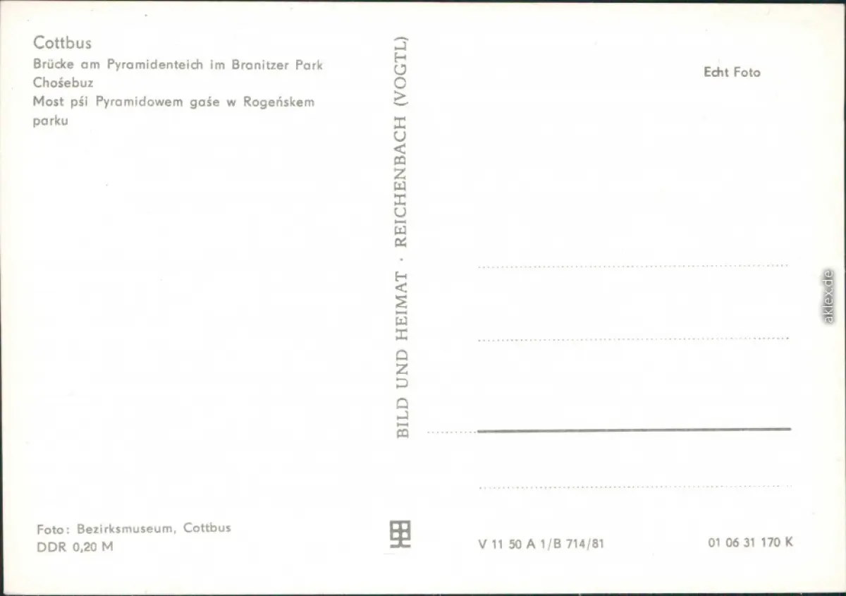Ansichtskarte Branitz-Cottbus Branitzer Park: Brücke am Pyramidenteich 1979