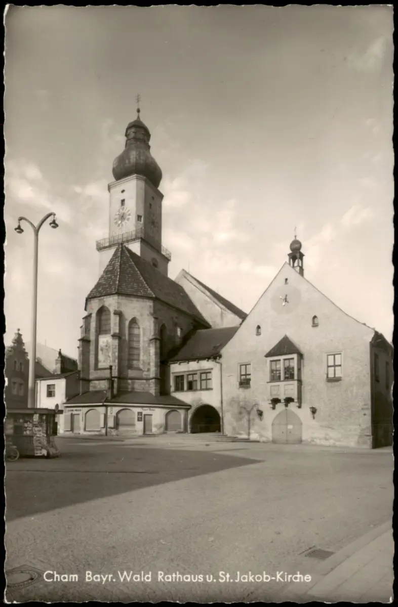 Ansichtskarte Cham (Oberpfalz) Rathaus, St. Jakob-Kirche und Kiosk 1962