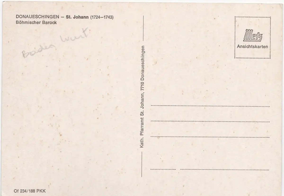 Verlagsangaben: Donaueschingen, Kath. Pfarramt St. Johann, Of 234/188 PKK.