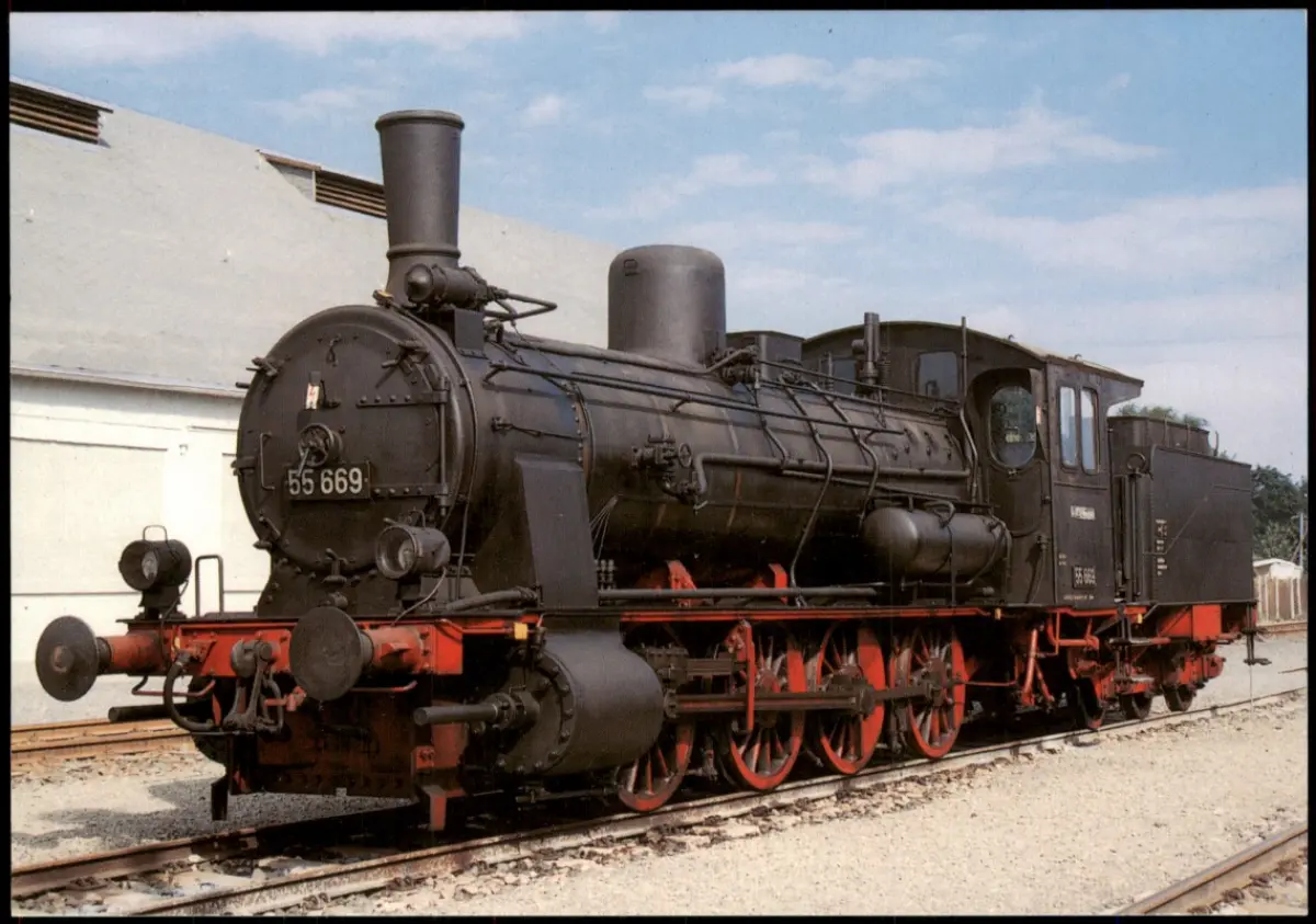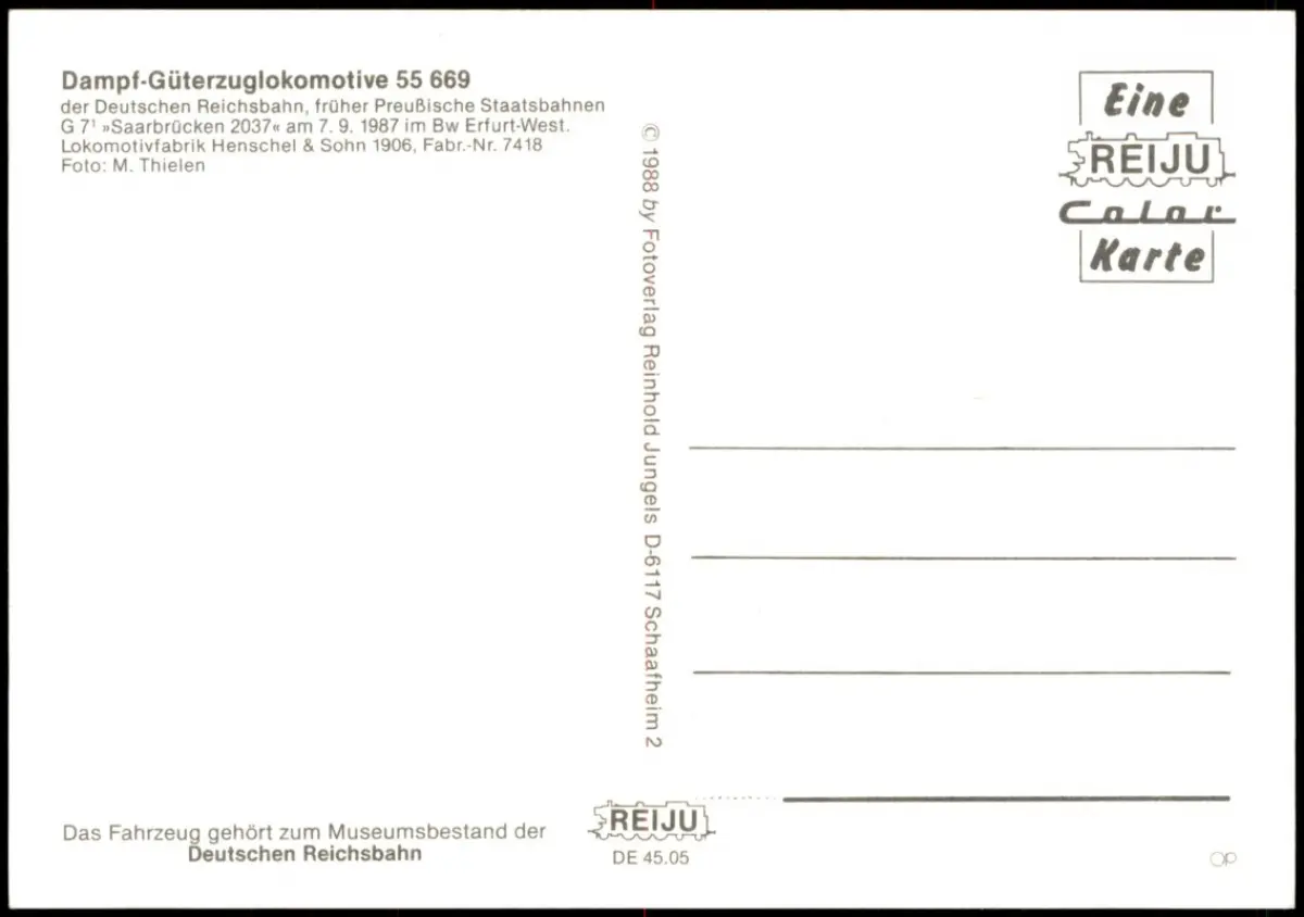 Infos: Dampf-Güterzuglokomotive 55 669 der Deutschen Reichsbahn, ehemals Preußische Staatsbahnen G 7¹ »Saarbrücken 2037«, aufgenommen am 7. September 1987 im Bahnbetriebswerk Erfurt-West. Die Lokomotive wurde 1906 von Henschel & Sohn (Fabr.-Nr. 7418) gebaut und gehört zum Museumsbestand der Deutschen Reichsbahn. Das Foto stammt von M. Thielen. Herausgegeben vom Fotoverlag Reinhold Jungels, D-6117 Schaafheim 2, ©1988, Seriennummer REIJU DE 45.05.
